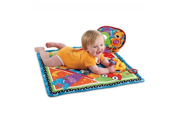 Kolorowa mata aktywności jest idealna w okresie gdy dzieci bawią się leżąc na brzuchu, lub gdy już samodzielnie siadają. Na odłączanym panelu do zabaw znajduje się zwierciadełko, wyjmowana kaczuszka z klikającymi krążkami i obracająca się kula. Dziecko kręcąc kulą uruchamia 8 krótkich melodyjek i 4 efekty dźwiękowe. Na macie znajduje się także atłasowy motylek, przestawne słoneczko i zabawka - zawieszka na kółeczku. Odłączany panel z zabawkami można zamocować w wózku lub łóżeczku.