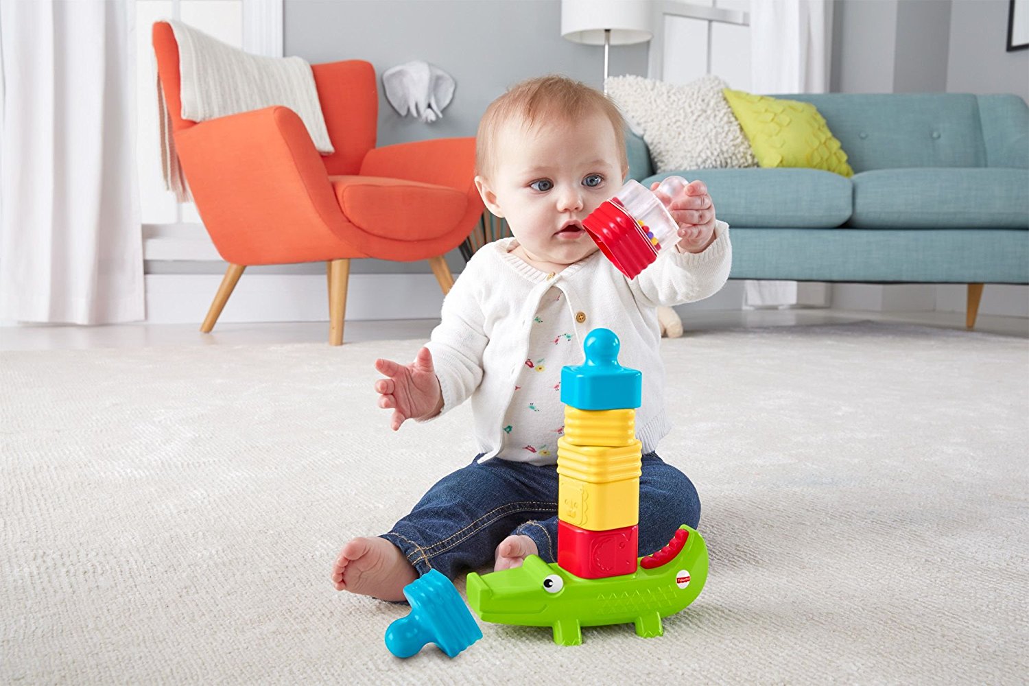 Dzieci będą miały rączki pełne zabawy dzięki tym poręcznym klockom i przyjaznemu krokodylkowi! Maluch może ułożyć na krokodylku do 6 klocków, tworząc wspaniałą wieżę. Klocki mają wypustkę do łatwego chwytania, a także otwór na spodzie, który zwiększa stabilność budowanej konstrukcji. 6 różnych klocków: do przekręcania i klekotania, z grzechotką, 2 klocki ze zwierzętami i 2 klocki z ciekawą fakturą, które pobudzają zmysły dziecka! Chwytanie i układanie klocków rozwija zręczność, a ciekawe faktury i grzechoczące dźwięki aktywizują zmysły. Budowanie uczy również związków między przyczyną a skutkiem.