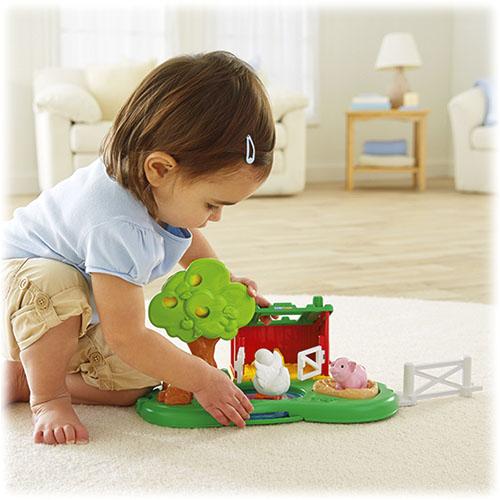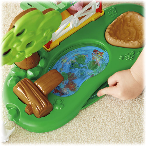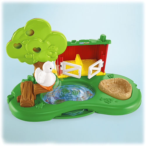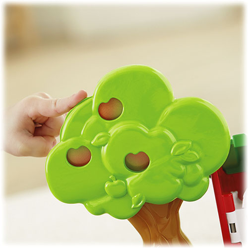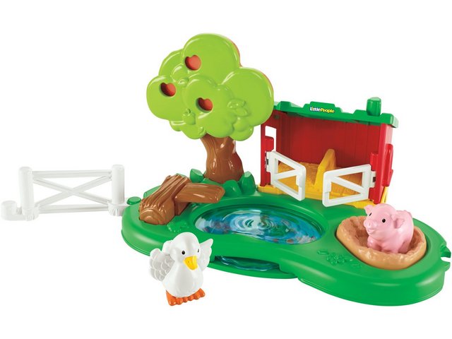 Odpocznij ze zwierzątkami nad stawem – zagroda dla świnek zapewnia świetną zabawę! Drzwiczki zagrody otwierają się i zamykają, tafla wody obraca się, a pod jej powierzchnią „pływają” rybki, jest też zabawna trampolina. Pokręć pokrętłem na jabłoni, aby jabłka dojrzały – zmieniają kolor z zielonego na żółty i na czerwony! To wspaniałe uzupełnienie zestawu Wesoła farma!