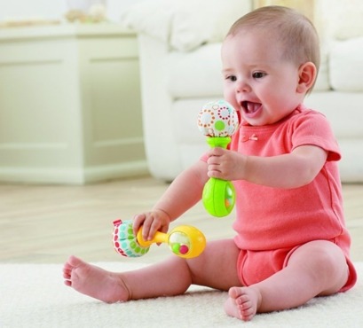 Zestaw dwóch grzechotek-marakasów w rozmiarze idealnym dla malutkich rączek! Przez przezroczyste elementy widać grzechoczące wewnątrz kolorowe koraliki! Miękkie końce z kolorowego materiału stymulują zmysł dotyku. Maluszek pokocha muzyczną zabawę!