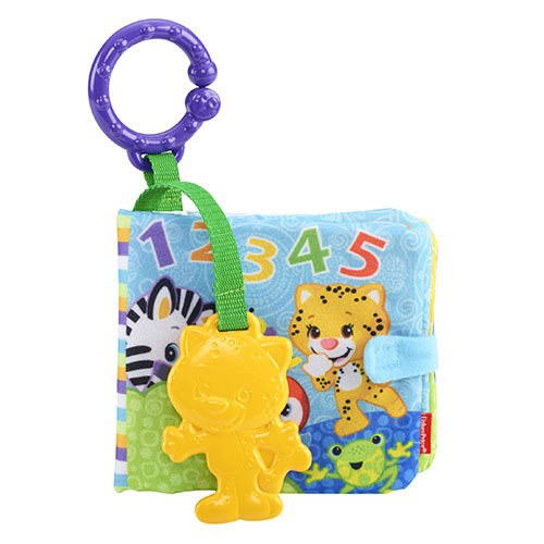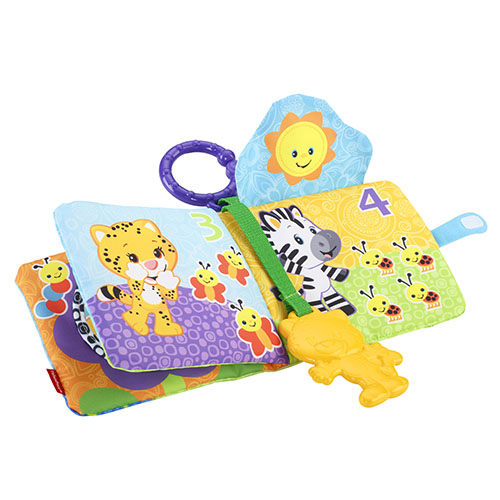 Czas przytulić się i zajrzeć do miękkiej książeczki z kolorowymi zwierzątkami, zabawą w liczenie od 1 do 5 oraz mnóstwem niespodzianek na sześciu stronach. Maluszek ma tu przed sobą tyle do odkrycia: dźwięki grzechotki, szeleszczący ogon, miękkiego misia zerkającego przez każdą stronę, a także gąsieniczkę gryzaczek pełzającą z boku książeczki! Książeczka posiada uchwyt ułatwiający zabieranie jej ze sobą – można ją przyczepić do spacerówki, fotelika samochodowego lub torby na pieluszki.