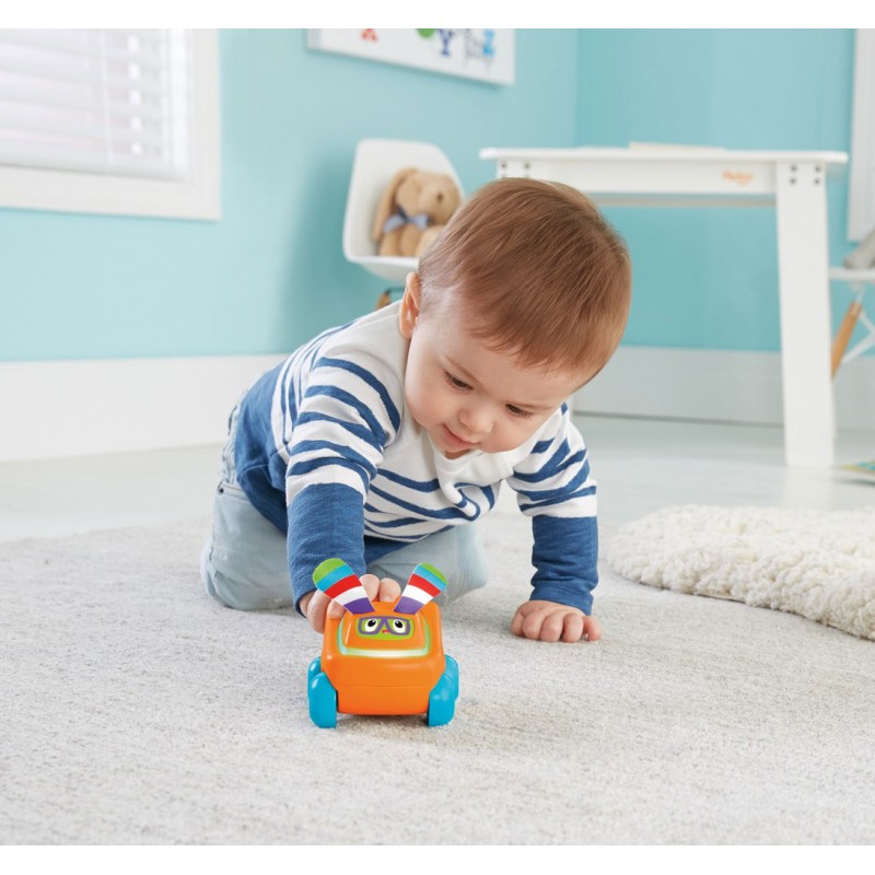Twoje dziecko będzie bawić się, tańczyć i kołysać do rytmów wygrywanych przez samochodzik DJ Franio! Samochodzik ze swobodnie obracającymi się kołami zachęca do zabawy w ruchu, a jego wesołe melodie i kolorowe światełka angażują zmysły dziecka. Po naciśnięciu zabawkowej buzi dziecko zostanie nagrodzone kolorowymi światełkami, radosnymi piosenkami i śmiesznymi dźwiękami. To doskonałe wprowadzenie do nauki zależności między przyczyną a skutkiem! Raczkując za autkiem, maluch będzie również rozwijał swoją sprawność ruchową! Zabawa, która rozwija: