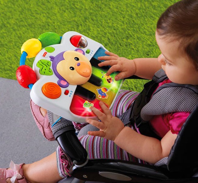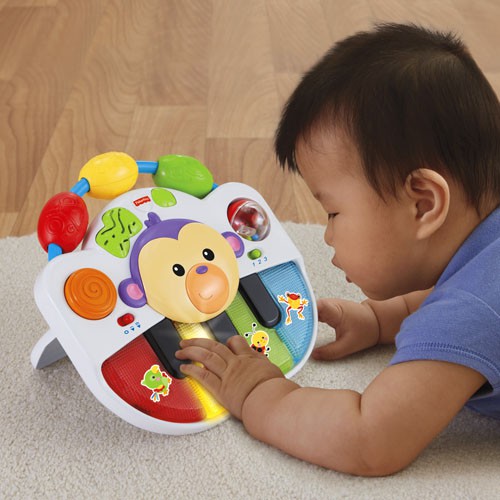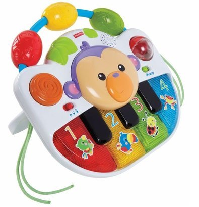 Muzyka, poznawanie przyjaznych zwierzątek, angażowanie do zabawy małych rączek i stópek... Pianinko Wesołej Małpki zapewnia zabawę i zdrowy rozwój! Maluch może bawić się na pleckach, kopiąc w pianinko; na brzuszku; na siedząco oraz na spacerze! Cztery klawisze aktywują dźwięki i muzykę, która może być odtwarzana w trzech trybach. Uchwyt z koralikami umożliwia łatwe przenoszenie.