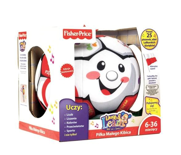 Piłka Małego Kibica X6155 z serii Laugh & Learn to limitowana edycja przygotowana specjalnie na EURO 2012. Dzieciom spodoba się odkrywanie liczenia, kolorów i przeciwieństw, możliwa jest również praca zespołowa i ustalanie kolejności. Zabawka posiada przycisk regulacji głośności, umożliwiający cichą zabawę. Dodatkowym atutem jest możliwość prania piłki w pralce po usunięciu elektronicznych elementów. Piłka wykonana jest z miękkiego, pluszowego materiału. W celu zmiany trybu zabawy wystarczy nacisnąć na buźkę piłeczki. Wszystkie teksty i piosenki są w języku polskim!