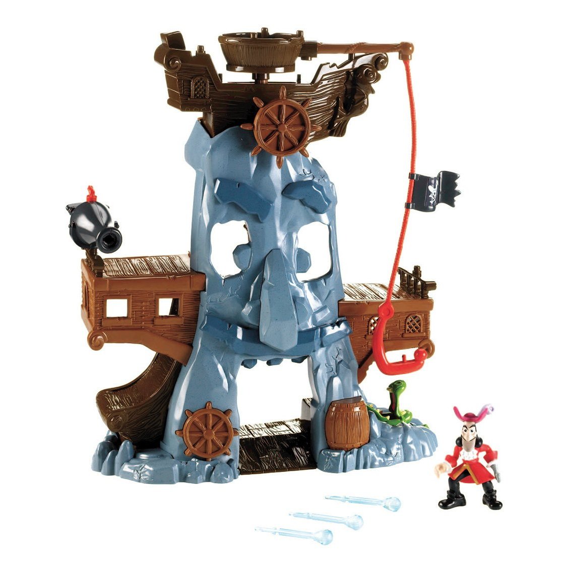 Niebezpieczne skały kapitana Haka to fantastyczny zestaw, który pozwoli dzieciom przeżyć mnóstwo pirackich przygód znanych z bajki telewizyjnej "Jake i Piraci z Nibylandii". Kapitan Hak może poruszać się wokół skały na linie zakończonej hakiem. Wrak okrętu na skale buja się z burty na burtę, a wyrzeźbiona w skale twarz rusza brwiami, wąsami i zębami.