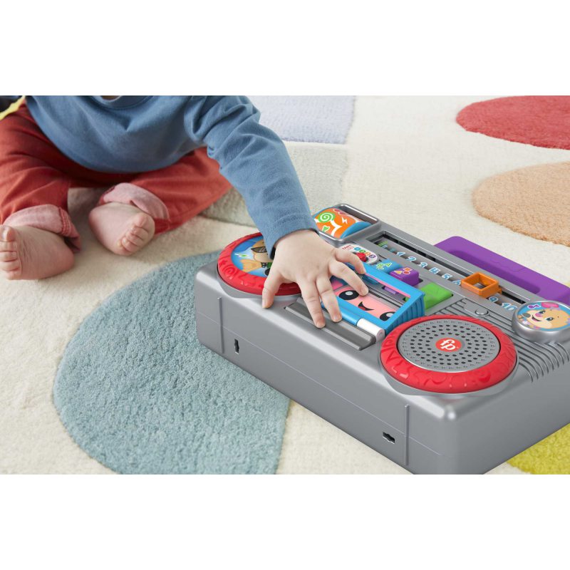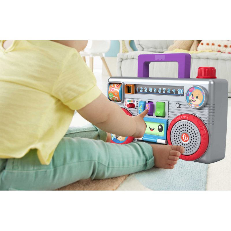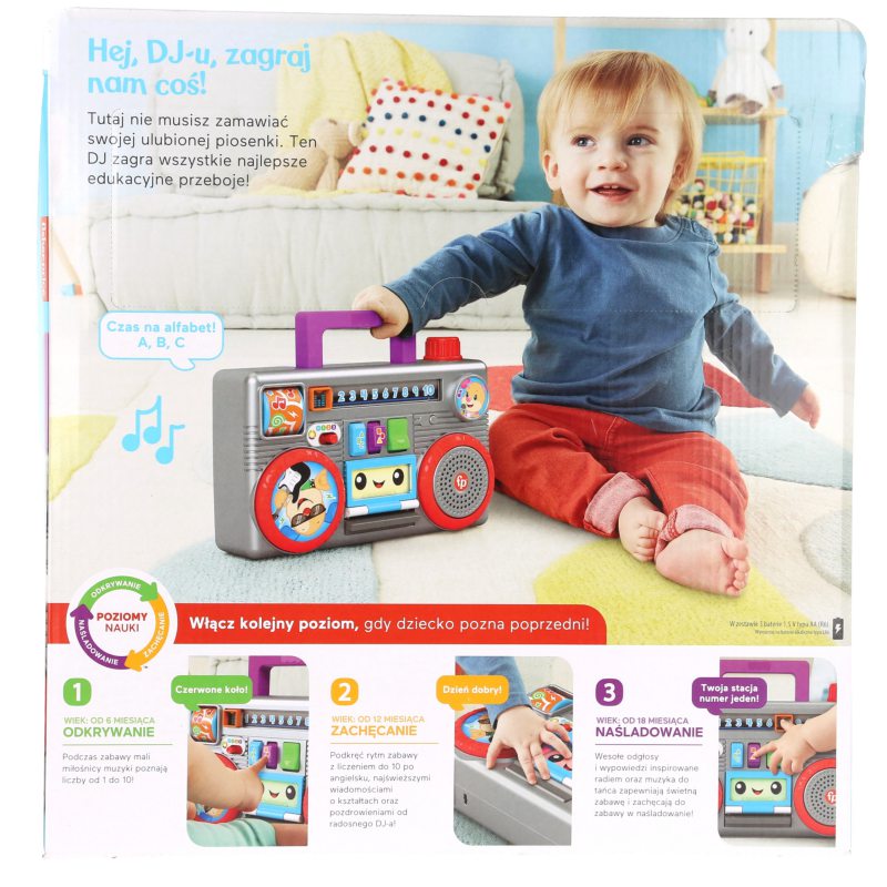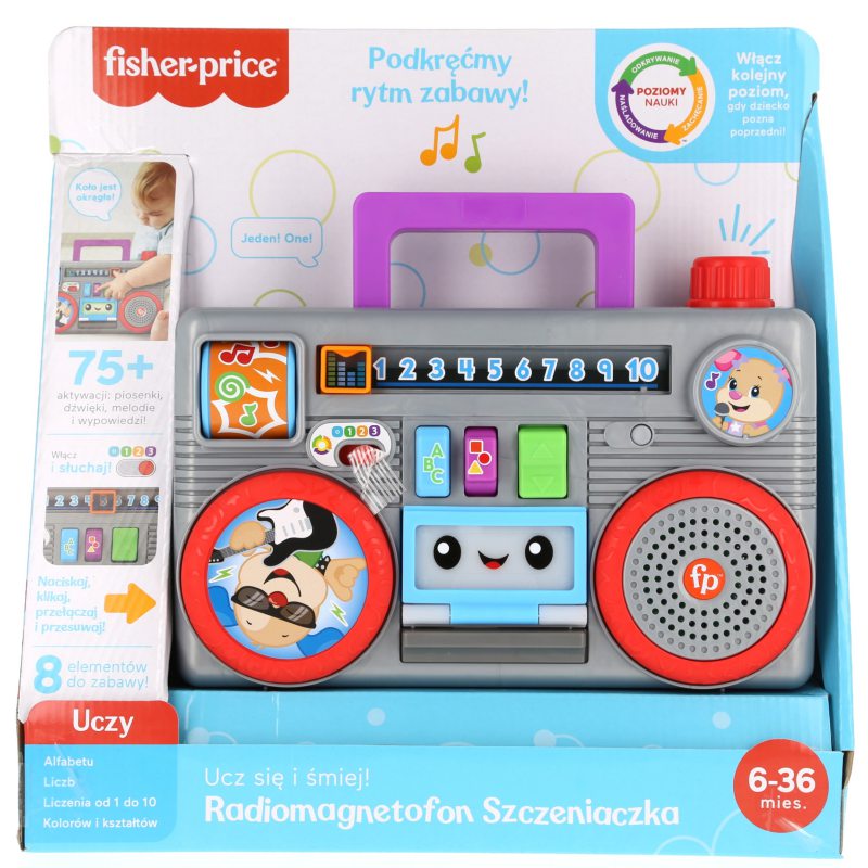 Retro Radiomagnetofon Szczeniaczka Fisher-Price „Ucz się i śmiej!” to zabawkowy zestaw stereo z licznymi elementami aktywizującymi, światełkami, muzyką i dźwiękami, które odkryje Twoje dziecko. Dzięki edukacyjnym wypowiedziom i piosenkom magnetofon pomaga w nauce literek, liczenia, kolorów i nie tylko, gdy dziecko przesuwa tuner, naciska przełączniki lub otwiera i zamyka otwór na kasety. Ta przenośna zabawka aktywizująca wykorzystuje technologię „Poziomy nauki”, dzięki której możesz dostosować treści edukacyjne do wieku i etapu rozwoju dziecka. Zabawka w polskiej wersji językowej.