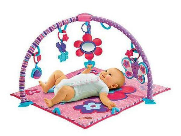 Różowa mata z pewnością zaciekawi maluszka na wiele sposobów! Na pałąku wisi wiele kolorowych zabawek, które bujają się podczas potrącania. Wśród tych zabawek maluch znajdzie gryzaczki, okrągłą grzechotkę, szeleszczącego motylka oraz lusterko w kształcie kwiatuszka. Podwieszone zabaweczki można odpiąć i dać dziecku do indywidualnej zabawy. Zachęca do aktywności na brzuszku i unoszenia główki. Usprawnia ręce, nóżki i mięśnie. Gdy maluch pociągnie za kwiatuszek usłyszy dźwięk pozytywki! Ta piękna mata z pewnością ozdobi pokój każdej małej księżniczki!