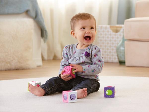 Oto klocki z niesamowitą niespodzianką – uśmiechniętymi buźkami, które kręcą się wewnątrz nich! W każdym z Ruchomych Klocków znajduje się obrotowa kuleczka, która nadaje nowy wymiar zabawy tradycyjnym klockom. Dziecko układa Ruchome Klocki wyjątkowo łatwo, bo nie dość, że idealnie pasują jeden na drugim, to jeszcze się kręcą! Uśmiechnięte kuleczki zakręcą się, gdy dziecko potoczy klocki.