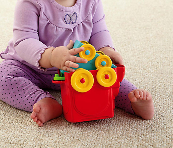 Tym sprytnym pociągiem można bawić się jak klasyczną zabawką do układania, ale możliwości zabawy i nauki jest znacznie więcej! Maluch może ustawić wagoniki na lokomotywie, tworząc wieżę, lub połączyć i „odjechać” pociągiem! Wagoniki można też włożyć jeden w drugi i schować w lokomotywie, bawiąc się podobnie jak foremkami. Wesoła zabawa uczy kształtów i kolorów!