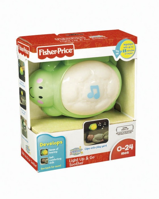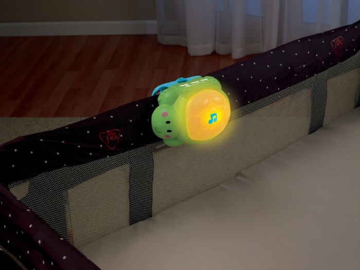 Świecący żółwik to mały przenośny uspokajacz, który można zastosować w kojcu, na przewijaku lub w większości łóżeczek z cienkimi szczebelkami. Żółwik jest niewielki i z łatwością zmieści się w torbie na pieluszki, pozwalając mamie zastosować go w każdej sytuacji. Żółwik odtwarza muzykę - można ją wyłączyć lub ustawić w jednym z dwóch poziomów głośności (cicho lub głośno). Wystarczy nacisnąć delikatnie żółwika, aby jego skorupa zapaliła się łagodnym rozproszonym światłem. Ponowne naciśnięcie uruchamia muzykę, dlatego podstawowe funkcje żółwika można obsługiwać jedną ręką! Gdy wybrany jest tryb odtwarzania muzyki, światełko łagodnie wygaśnie po 5 min., a muzyka będzie grać przez 15 minut.