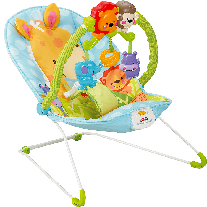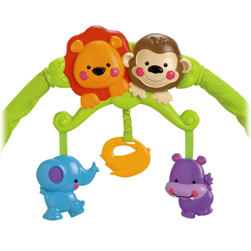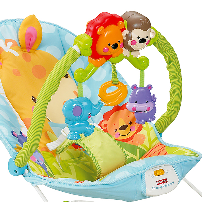 Uspokajający leżaczek ze zwierzątkami ma wszystkie zabawki w zasięgu rączek. Na obitym miękką tkanina pałąku zawieszone są trzy zabawne zwierzątka. Dziecko uderzając je lub pociągając uruchamia efekty dźwiękowe, w jednym zwierzątku dzwoneczek, w drugim grzechoczące koraliki, a w trzecim dwie piosenki dwa efekty dźwiękowe.