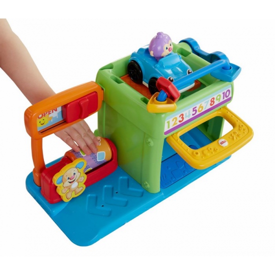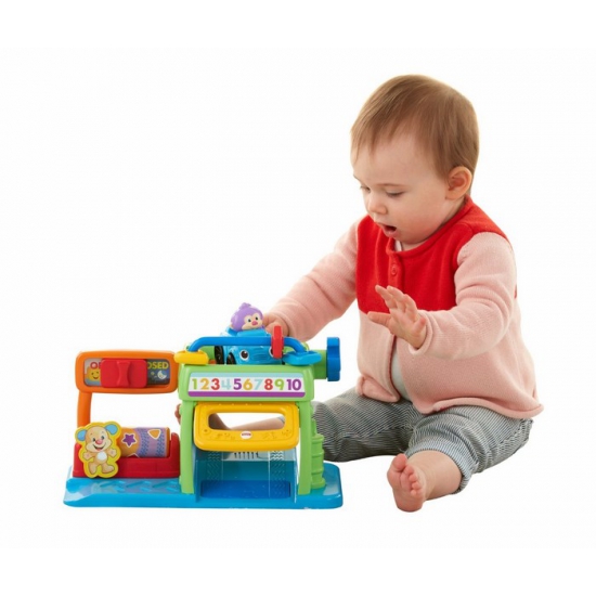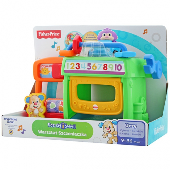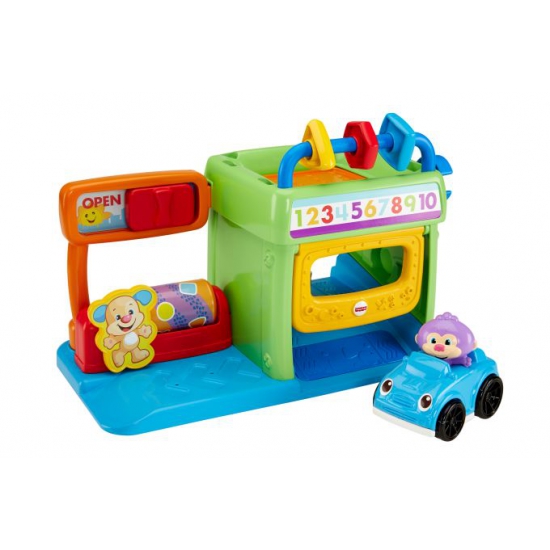 Szczeniaczek jest gotowy podrasować samochód Małpki (oraz zasób wiedzy i sprawność ruchową dziecka)! Dziecko może postawić autko na górnym stanowisku oraz pociągnąć klucz, aby zrzucić w dół samochód przy akompaniamencie wesołych odgłosów i piosenek! Małpka spada w dół, by wyjechać przez drzwi „naprawiona” i gotowa do zatankowania i mycia! Dziecko może też naciskać Szczeniaczka lub kręcić wałeczkiem, aby uruchamiać piosenki, dźwięki i komunikaty, które uczą liczb, liczenia, kształtów i kolorów. Kolorowe koraliki, przesuwany znak dzień/noc oraz autko pomogą rozwijać zręczność i wyobraźnię dziecka! Zawartość edukacyjna w języku polskim.