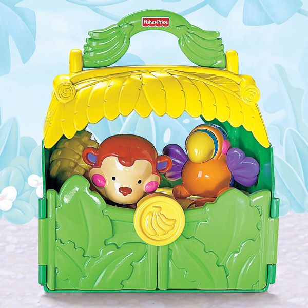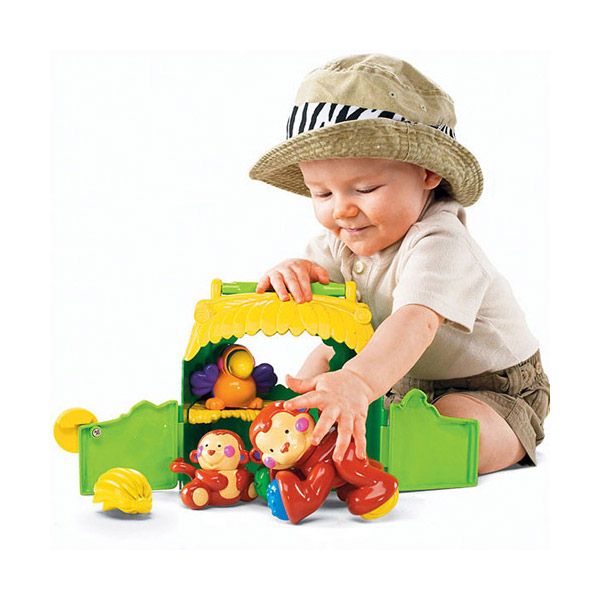W zestawie dzieci znajdą dwie małpki – mamę i jej dziecko oraz tukana. Gdy poruszymy głową mamy-małpki, to wydobędą się z niej zabawne małpie odgłosy; gdy obrócimy głowę małpiątka, to usłyszymy pstrykanie. Kiedy potrząśniemy tukanem, zacznie chichotać. Kiść bananów to z kolei grzechotka. Całość zamknięta jest w rozkładanym “domku”, w którym można zwierzątka przechowywać i przenosić. Zwierzątka mogą jeździć Pociągiem Zaskakujących Zwierzaków.