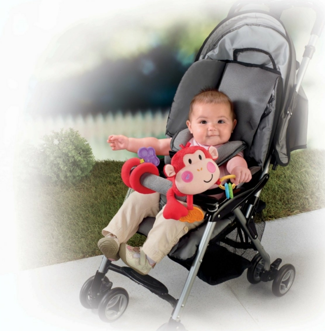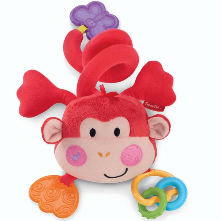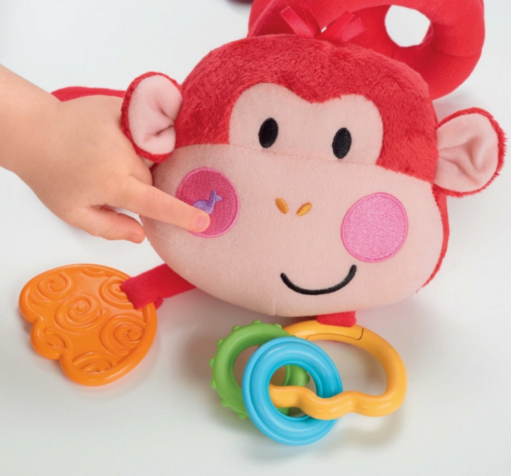 Fisher-Price zawieszka pluszowa małpka to zabawka, która przyspiesza rozwój dziecka! Tę zabawną, pluszową małpkę można zawiesić na ramie wózeczka, aby zabawić maluszka. Gdy dziecko naciśnie na policzek małpki, uruchomi krótkie melodyjki. Pluszowa Małpka do wózka ma zabawne łapki i 2 grzechoczące koralki. Dodatkowo zabawka zawiera także gryzaczek.