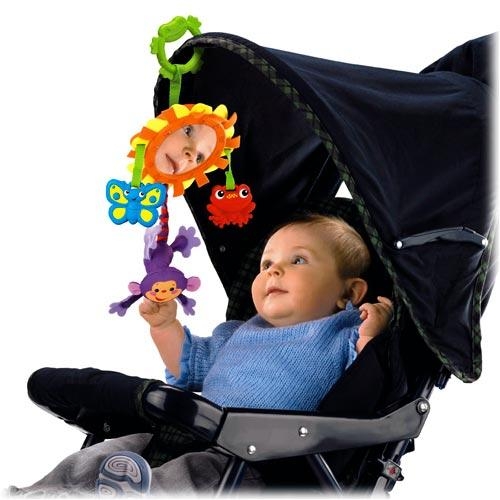 Zawieszka przyczepiana do wózka z wesołymi zwierzakami zapewni dziecku zabawę podczas spacerów. Lusterko oraz kolorowe zwierzątka pobudzą fantazję i rozwiną zdolności dziecka. Dodatkowo zabawka posiada mięciutką małpkę, która po pociągnięciu wydaje uspokajające dźwięki. Praktyczny klips pozwala zamocować zabawkę do wózka. Zabawka wymaga użycia baterii: dołączono.