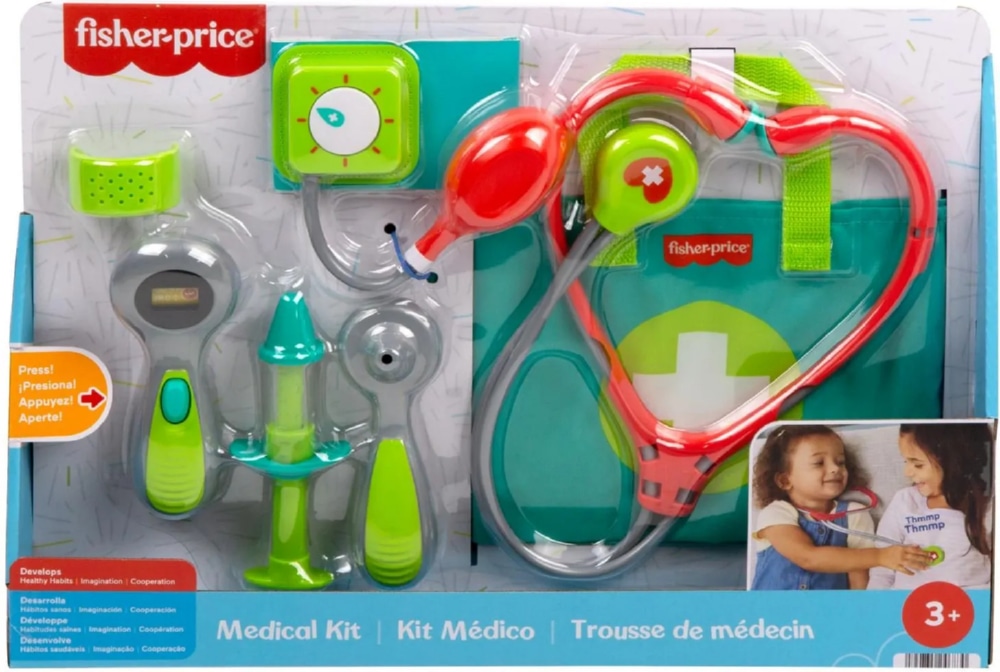 Dzięki zestawowi medycznemu Fisher-Price maluchy w wieku przedszkolnym mogą „leczyć” i „opiekować się” pacjentami, odgrywając niekończące się zabawy w lekarza! Zestaw zawiera 7 elementów o tematyce medycznej, z których mogą korzystać mali lekarze, w tym stetoskop do „osłuchiwania” serca pacjenta, termometr do „mierzenia” temperatury, otoskop do zaglądania do uszu oraz mankiet do pomiaru ciśnienia krwi z obrotowym wskaźnikiem. Nawet zastrzyk staje się zabawą dzięki zabawkowej strzykawce i opatrunkowi na udawane rany.