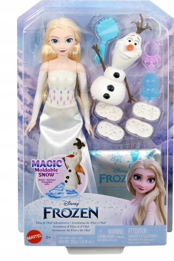 Ciesz się magicznym śnieżnym dniem z lalką Elsą i figurką Olafa! Ten zestaw przygodowy, inspirowany filmem „Kraina lodu 2” firmy Disney, zawiera lalkę modową Elsę oraz figurkę Olafa, która może zamienić się w stempel! Dzieci mogą przymocować 4 różne stemple do spodu Olafa i tworzyć zabawne kształty w „śniegu” .