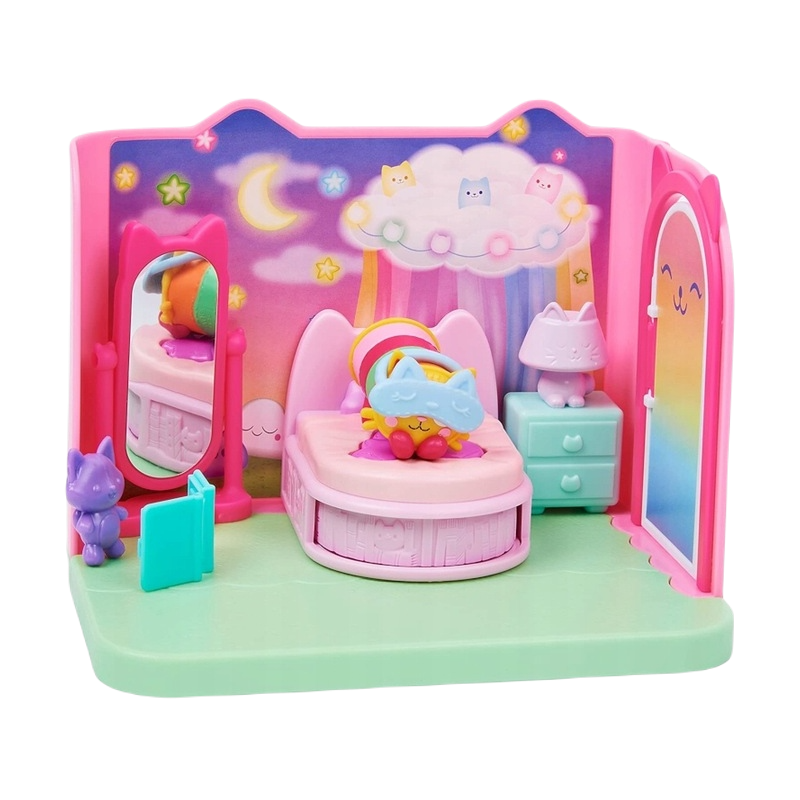 Sypialnia Gabi wyposażona jest w urocze fioletowo różowe łóżeczko. Na stoliku nocnym znajduje się lampka nocna z kloszem, znajdziemy tu także wolnostojące lustro oraz dwie pufy, przytulanka oraz "Pillow Cat". Cała sypialnia jest urządzona oczywiście w kocim klimacie. W pufach znajdują się niespodzianki, a gdy nadusimy na przycisk znajdujący się na środku łóżka, jego przód zmieni wygląd.