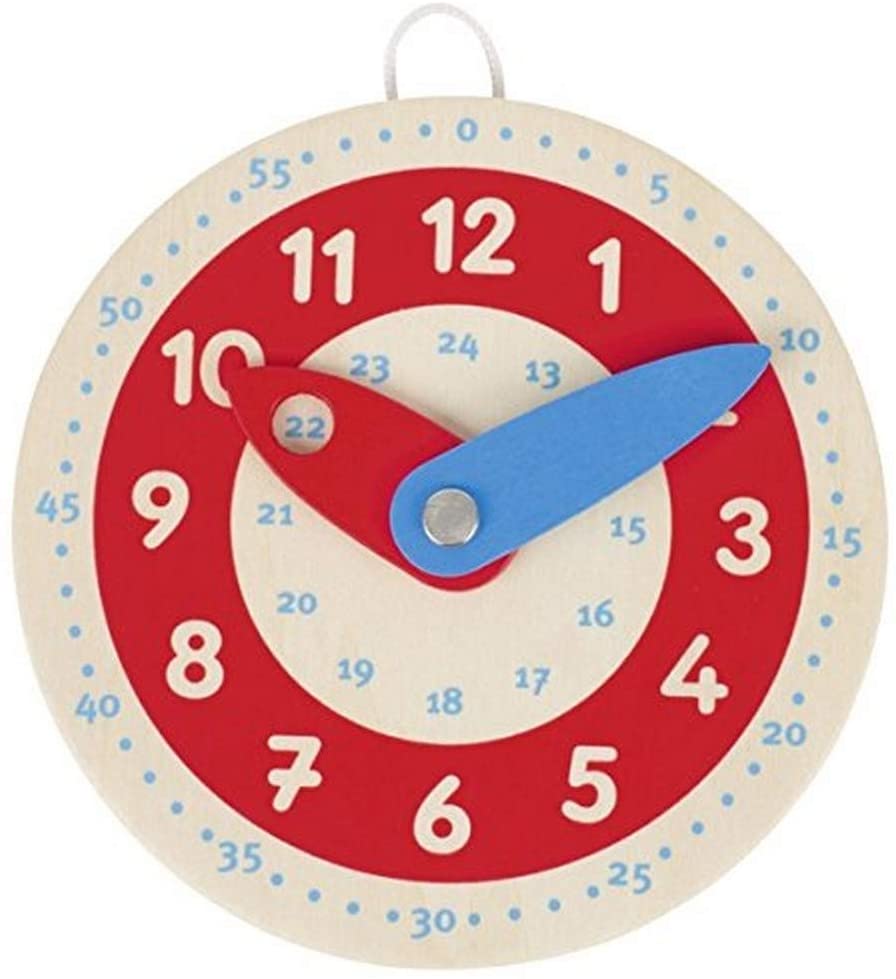 Pierwszy drewniany zegar idealnie sprawdzi się do nauki godzin dla dzieci. Wskazówka z otworem na palec oraz potrójna tarcza umożliwia naukę w systemie 12-sto i 24-ro godzinnym, a także naukę minut. tarcza zegara jest w dwóch kolorach, tak jak wskazówki. Czerwona wskazówka uczy godzin, niebieska minut. Z tyłu zegara znajduje się sznureczek umożliwiający zawieszenie go w dowolnym miejscu. Niewielki rozmiar sprawia, że zegar można zabrać ze sobą, np. w podróż umilając tym samym dziecku czas spędzony w aucie czy pociągu.