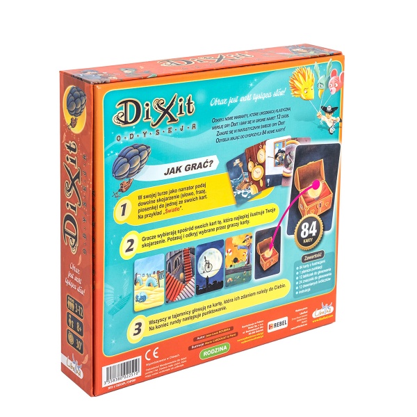 Z Dixit Odyssey odkryjesz na nowo magiczny świat Dixit – najczęściej nagradzanej gry ostatnich lat. Daj ponieść się wyobraźni, odkrywając tajemnice nowych kart. Tylko uważaj, żeby nie wpaść w pułapki zastawiane przez innych graczy! Dzięki nowym wariantom, w grze może brać udział aż do 12 osób. Razem wyruszcie na poszukiwanie nowych, zaczarowanych światów.