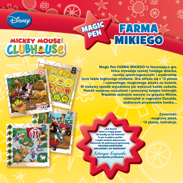 Nowoczesna, interaktywna zabawa edukacyjna dla dzieci w wieku przedszkolnym i wczesnoszkolnym. Staranie dobrany zestaw zadań i grafika z uwielbianymi przez dzieci postaciami Disneya sprawiają, że nauka jest prawdziwą przyjemnością. Dziecko ma do wykonania zadania umieszczone na 12 planszach przedstawiających scenki z życia na farmie Mikiego. Samodzielnie lub pod okiem rodziców szuka odpowiedzi, przybliżając do wybranego elementu magiczny pisak. Jeśli odpowiedź jest prawidłowa, zostanie nagrodzona delikatnym światełkiem i dźwiękiem! W ten sposób dziecko jest zachęcone do poszukiwań prawidłowych odpowiedzi i aktywnej nauki. Zadania obejmują liczenie, skupienie na szczególe, rozpoznawanie i nazywanie kolorów, dopasowanie cienia i inne. Zabawa zapoznaje dzieci z praktyczną wiedzą o otaczającym świecie, ćwiczy spostrzegawczość i uczy nowych pojęć. Piękna grafika w stylu Disneya i magiczny pisak robią grę jeszcze atrakcyjniejszą. W instrukcji wyjaśniono wszystkie zabawy – opowiedz swojemu maluchowi każdą historyjkę i zobacz, jak rozbudzają jego wyobraźnię.