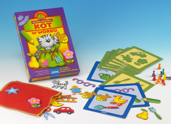 Kot w worku zawiera elementy z grubej tektury, które umieszczone są w woreczku, a dziecko za pomocą dotyku musi rozpoznać, co przedstawia wylosowany element. Jak odgadnie umieszcza żeton na planszy, na takim samym obrazku jak wylosowany. Gra rozwija wyobraźnię przestrzenną i zdolności manualne.