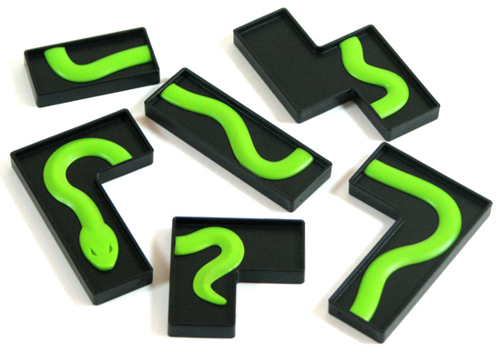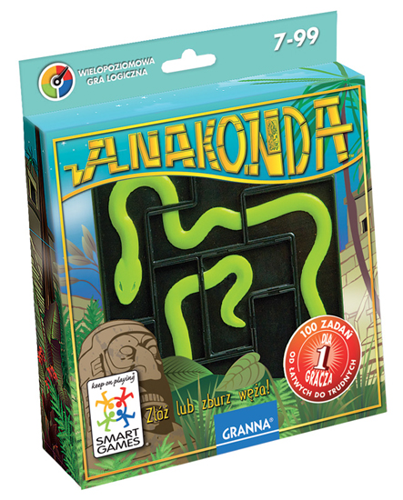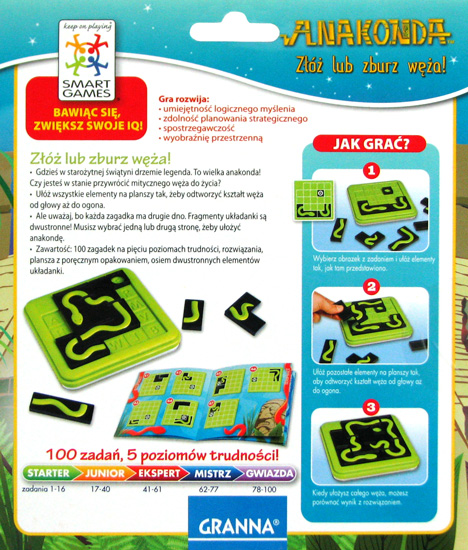 Ułóż wszystkie elementy na planszy tak, żeby odtworzyć kształt węża od głowy aż do ogona. Ale uważaj, bo każda zagadka ma drugie dno. Fragmenty układanki są dwustronne! Musisz wybrać jedną lub drugą stronę, żeby ułożyć anakondę.