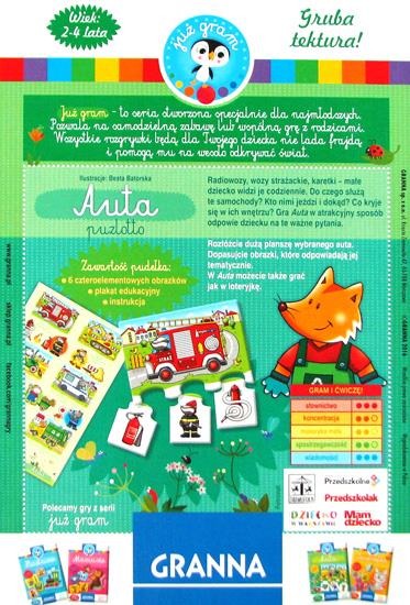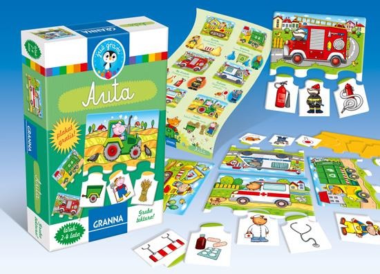 Bohaterami tego puzzlotto są samochody, które mają do wykonania ważne zadania. Twoje dziecko dowie się wielu ciekawych rzeczy: jakie zawody łączą się z danymi autami i jakie przedmioty kryją się w ich wnętrzu. Gra „Auta” to świetna zabawa, rozwijająca spostrzegawczość, koncentrację i zdolności manualne dziecka.