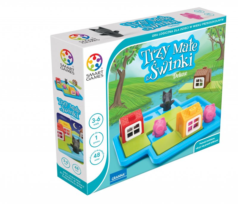 Gra TRZY MAŁE ŚWINKI ma dwa warianty. W każdym znajdują się 24 zadania. W wariancie dziennym – bez wilka – dzieci układają świnki tak, aby swobodnie bawiły się one poza domkami. W wariancie nocnym – z wilkiem – dzieci muszą pomóc świnkom i szybko ukryć je w domkach. W pudełku znajduje się również książeczka z ilustracjami do bajki o trzech małych świnkach. Dzięki niej możesz opowiedzieć własną wersję bajki o dzielnych zwierzątkach.