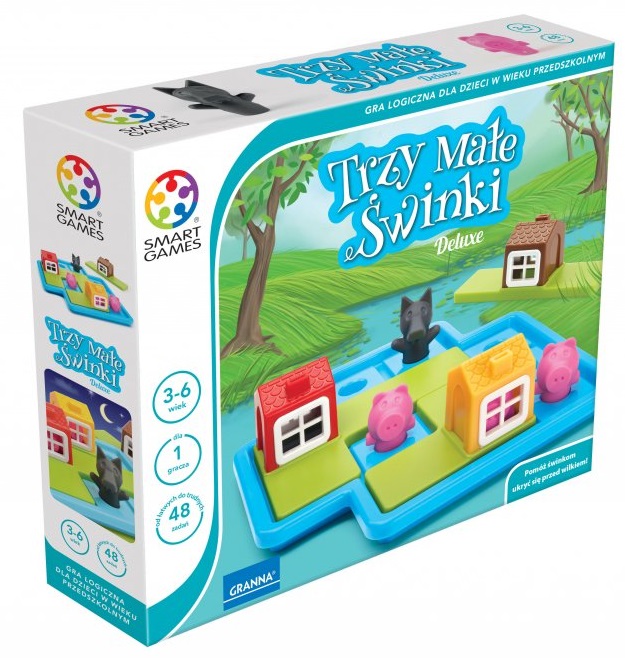 Gra TRZY MAŁE ŚWINKI ma dwa warianty. W każdym znajdują się 24 zadania. W wariancie dziennym – bez wilka – dzieci układają świnki tak, aby swobodnie bawiły się one poza domkami. W wariancie nocnym – z wilkiem – dzieci muszą pomóc świnkom i szybko ukryć je w domkach. W pudełku znajduje się również książeczka z ilustracjami do bajki o trzech małych świnkach. Dzięki niej możesz opowiedzieć własną wersję bajki o dzielnych zwierzątkach.