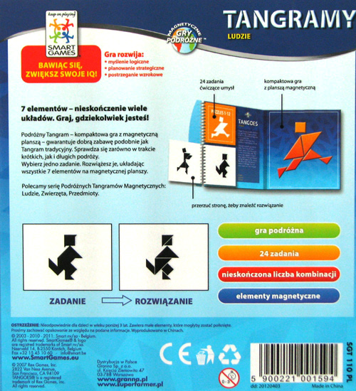 Tangram to kwadrat, który składa się z 7 części. Celem gry jest ułożenie obrazka przedstawiającego ludzi według przygotowanego wzorca (najczęściej narysowanych konturów tego obrazka) lub własnej wyobraźni. Ta podróżna wersja gry logicznej rozwija logiczne myślenie, planowanie strategiczne i postrzeganie wzrokowe. Wyposażony w magnetyczną planszę, gwarantuje dobrą zabawę w trakcie krótkich, jak i długich podróży. Wybierz jedno zadanie. Rozwiążesz je, układając wszystkie 7 elementów na magnetycznej planszy.