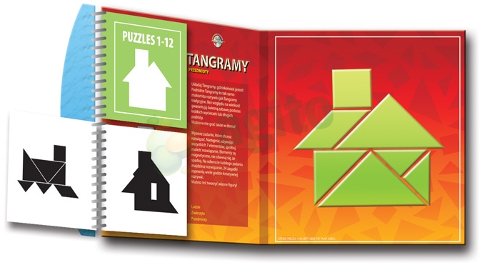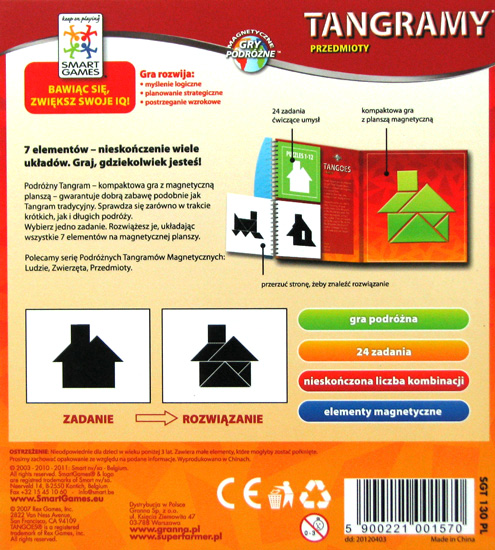 Tangram to kwadrat, który składa się z 7 części. Celem gry jest ułożenie obrazka przedstawiającego różne przedmioty według przygotowanego wzorca (najczęściej narysowanych konturów tego obrazka) lub własnej wyobraźni. Ta podróżna wersja gry logicznej rozwija logiczne myślenie, planowanie strategiczne i postrzeganie wzrokowe. Wyposażony w magnetyczną planszę, gwarantuje dobrą zabawę w trakcie krótkich, jak i długich podróży. Wybierz jedno zadanie. Rozwiążesz je, układając wszystkie 7 elementów na magnetycznej planszy.