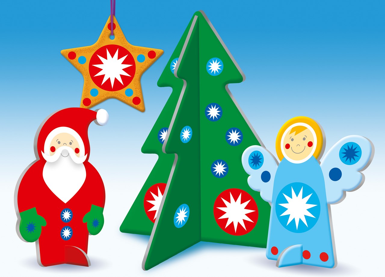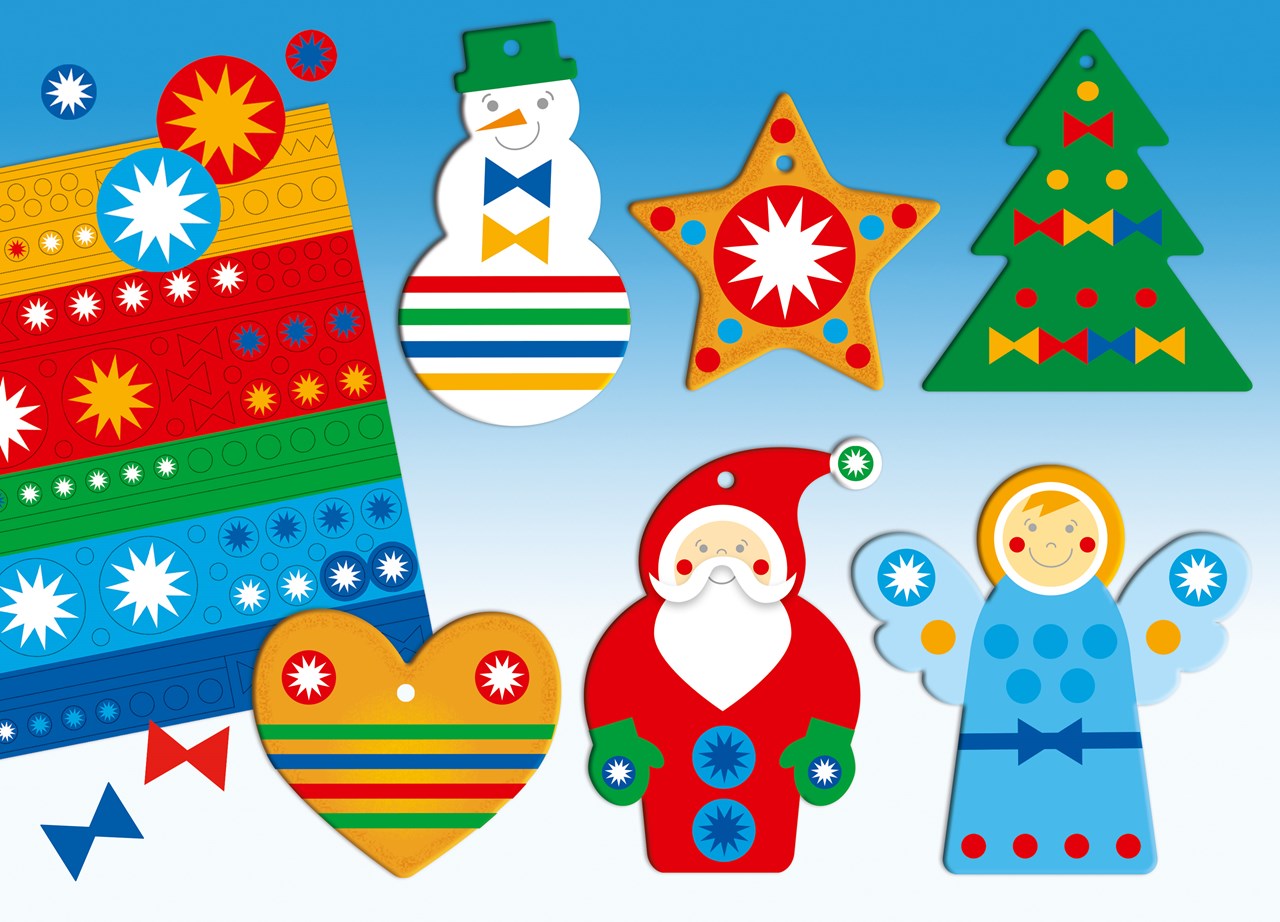 Tworzenie własnych dekoracji świątecznych z gotowych kształtów z grubej tektury oraz kolorowych naklejek, sprawi dzieciom wiele radości i rozwinie ich kreatywność.