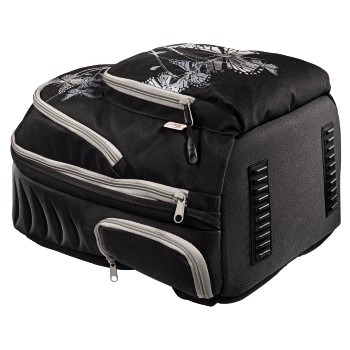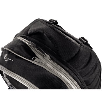 Wszystkie kieszenie zapinane są na zamek błyskawiczny. Tylna część plecaka wykonana jest ze specjalnej utwardzanej pianki, wymusza