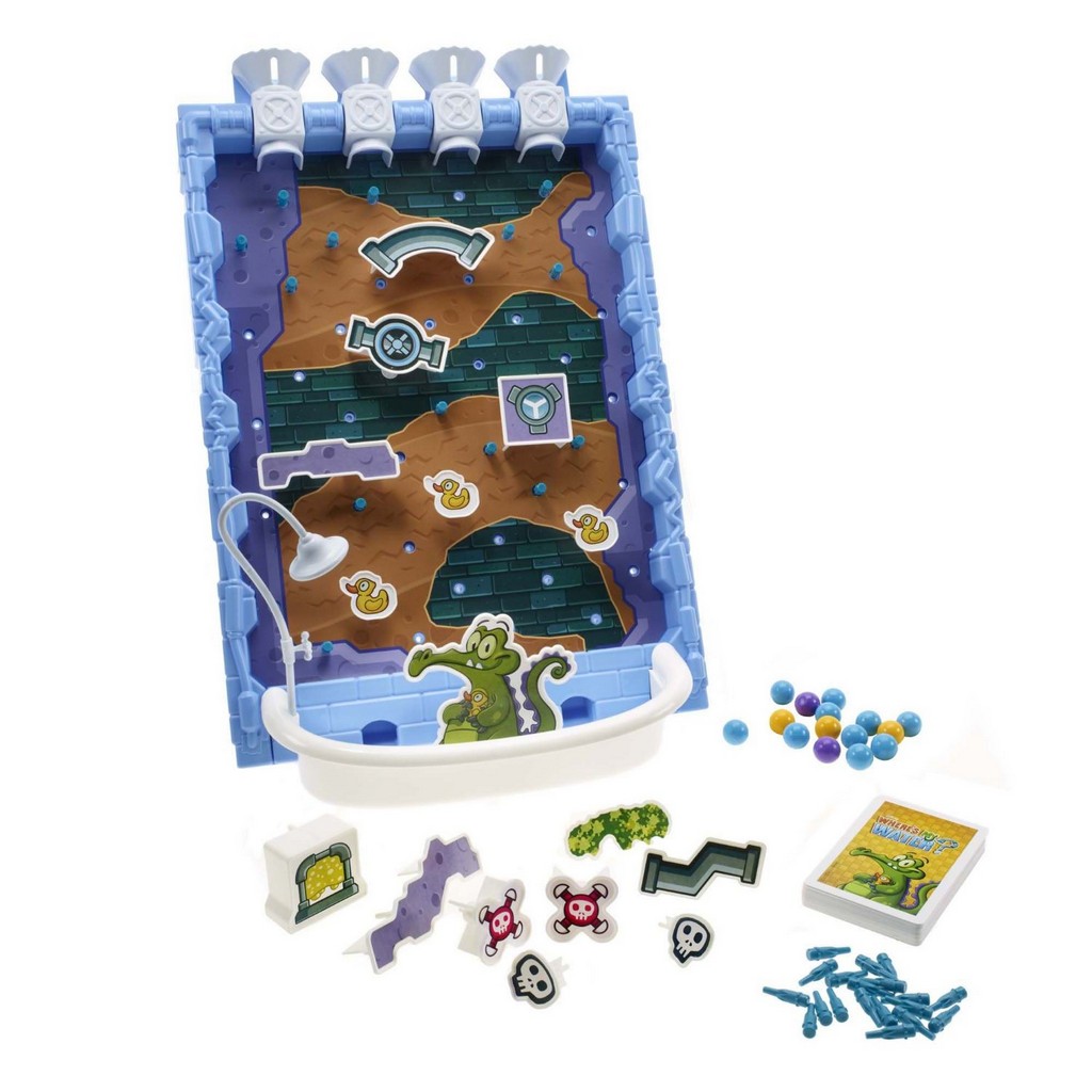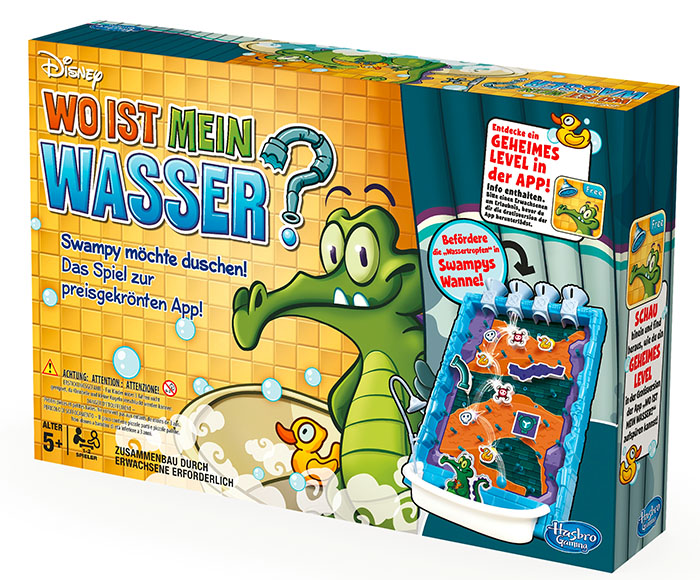 Where’s my water? to jedna z najbardziej znanych aplikacji na świecie tym razem w postaci gry planszowej. Krokodylek Swampy bardzo chciałby wziąć prysznic, jednak w jego łazience nie ma wody. Zadaniem graczy jest ją znaleźć i doprowadzić do mieszkania nieszczęśnika tak, by mógł się wykąpać. Jak to zrobić? Gracze mają za zadanie doprowadzić wodę do wanny krokodylka, co wcale nie będzie takie proste, gdyż na planszy kryją się pułapki. Kto pierwszy pomoże Swampy’emu wziąć kąpiel, wygrywa! Gra uczy szybkiego myślenia i sprytnego pokonywania przeszkód. Pudełko zawiera: planszę, ramkę na planszę, figurkę Swampy’ego, 4 lejki, wannę z prysznicem, 2 rurki, 15 niebieskich kuleczek (kropelek wody), 10 przeszkód, 3 kaczuszki z żółtymi kulkami, 2 fioletowe kuleczki (toksyczne krople), 30 kołków do planszy, zestaw 36 kart, stojak do planszy oraz instrukcję. Przeznaczona jest dla 1-2 graczy powyżej 5 roku życia. Wymagany montaż przez osobę dorosłą.