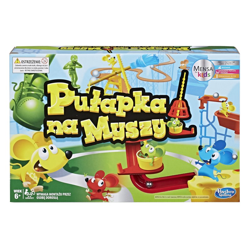 Pułapka na Myszy to kultowa gra zręcznościowa pełna akcji i ruchu! Nawigujcie pionkami myszek przez pole do gry, aby wykraść ser oponenta! Jednak pamiętajcie, na planszy aż roi się od pułapek! Huśtający się but, kula, a nawet skoczek skaczący do basenu - dowiedz się, jak wszystkie te elementy wpłyną na reakcję łańcuchową, mającą za zadanie zatrzymanie niczego niespodziewającej się myszki! Ścigajcie się do samej mety i zbierzcie ser przeciwnika! Zbierzcie 6 kawałków sera jako pierwsi aby wygrać grę! Gra ćwiczy rozumienie przyczyn i skutków, uczy podejmowania decyzji i budowania.
