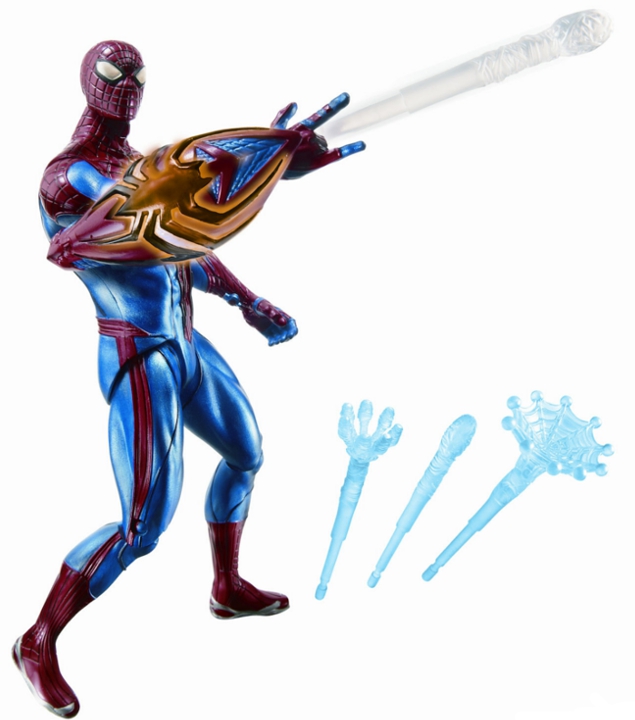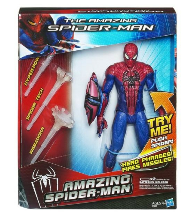 Hasbro SpiderMan Figurka z Wyrzutnią i Efektami 37205. Figurka posiada wszystkie ruchome stawy kończyn, wykonana jest z wysokiej jakości materiałów. Wyposażona jest w wyrzutnię z pociskiem, efekty dźwiękowe oraz świetlne. Dzięki niej jeszcze dokładniej odtworzysz scenki z nowego filmu „Niesamowity Spider-Man”.