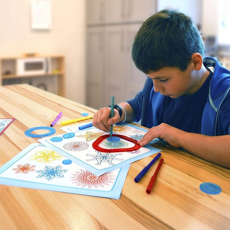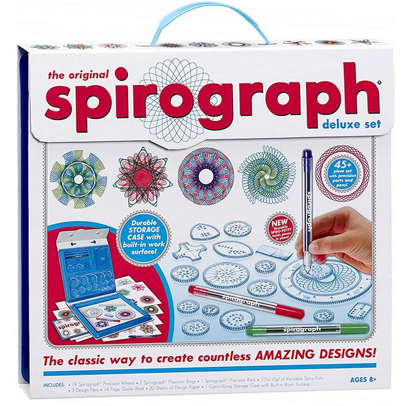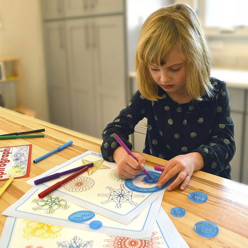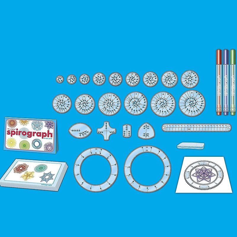 Zestaw Spirograf Deluxe zawiera koła i pierścienie oryginalne, przebudowane i zaktualizowane. Zestaw zawiera również 20 arkuszy papieru projektowego oraz przewodnik projektowy, który wyjaśnia podstawy rysowania za pomocą Spirografu, a także instrukcje krok po kroku do tworzenia własnych wzorów. Zabawa spinografem to miłe wprowadzenie do świata sztuki.