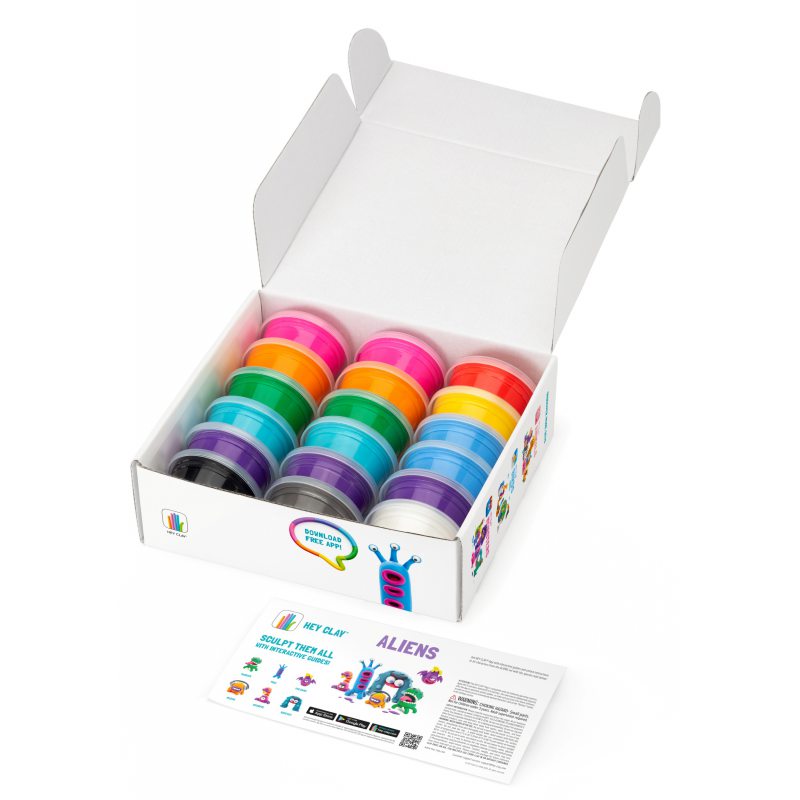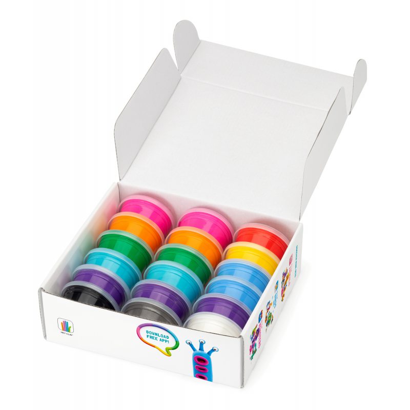Zestaw składa się z 18 pojemników z miękką, delikatną i pachnącą masą. Kolory przedstawione są na opakowaniu. Masa plastyczna pozwala na stworzenie wszystkich 6 postaci z zestawu. Pewna ilość masy pozostaje, można ją użyć do realizacji własnych kreatywnych pomysłów. Kiedy skończysz lepić figurkę, odstaw ją na 24 godziny, aby stwardniała. Po tym czasie możesz się nią bawić! Kształtuj figurki, korzystając z instrukcji krok po kroku w aplikacji. Dowiedz się, jak wyrzeźbić każdą z nich w zabawny i interaktywny sposób. W zestawie otrzymujesz również bezpłatny dostęp do aplikacji HEY CLAY, która jest fascynującym i inspirującym przewodnikiem po kreatywnym modelowaniu.