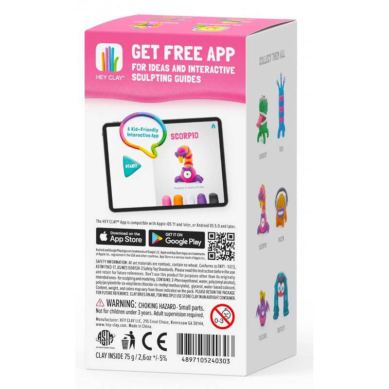 Zestaw składa się z 5 pojemników z miękką, delikatną i pachnącą masą. Kolory przedstawione są na opakowaniu. Masa plastyczna pozwala na stworzenie postaci z zestawu. Pewna ilość masy pozostaje, można ją użyć do realizacji własnych kreatywnych pomysłów. Kiedy skończysz lepić figurkę, odstaw ją na 24 godziny, aby stwardniała. Po tym czasie możesz się nią bawić! Kształtuj figurki, korzystając z instrukcji krok po kroku w aplikacji. Dowiedz się, jak wyrzeźbić każdą z nich w zabawny i interaktywny sposób. W zestawie otrzymujesz również bezpłatny dostęp do aplikacji HEY CLAY, która jest fascynującym i inspirującym przewodnikiem po kreatywnym modelowaniu.