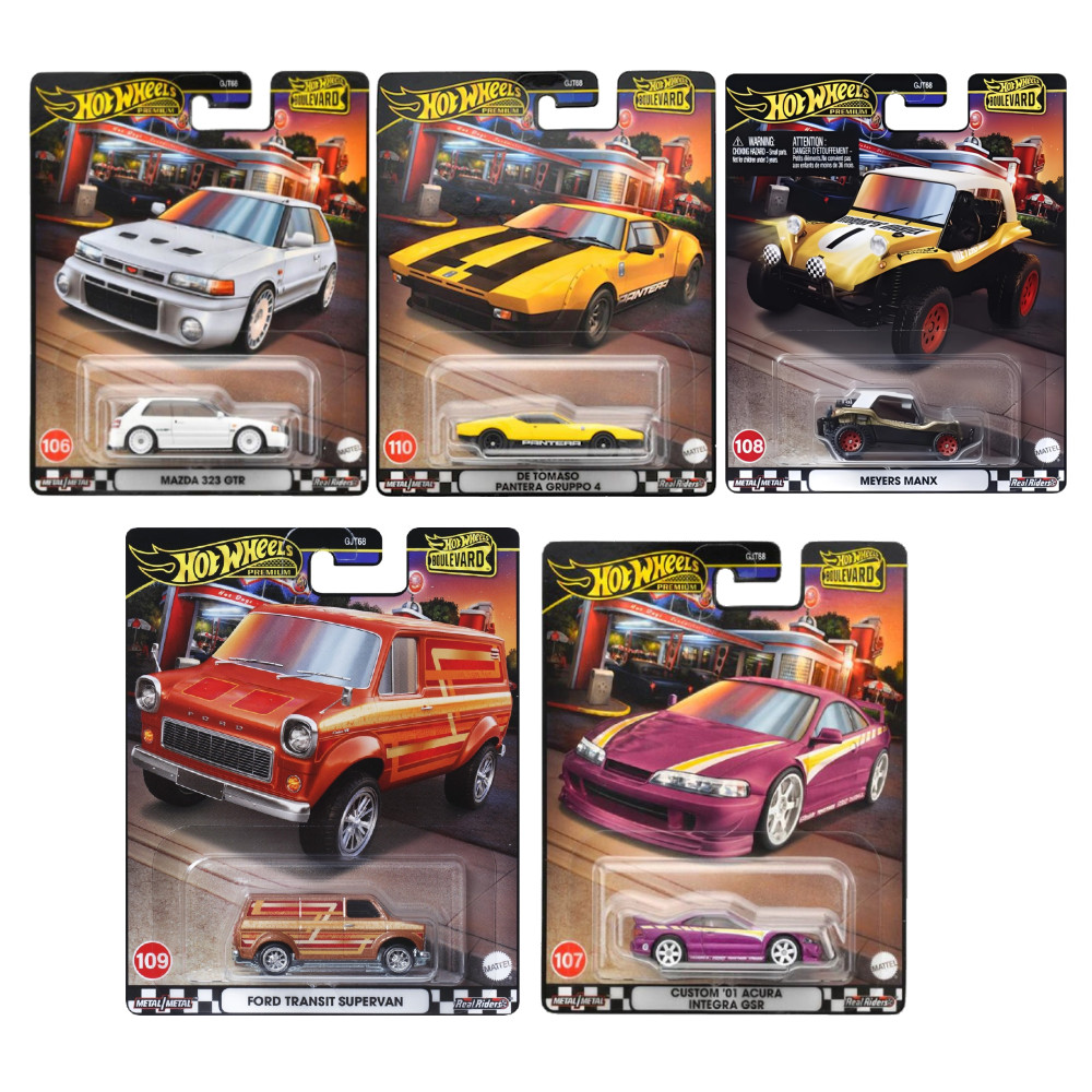 Hot Wheels Boulevard Zestaw 5 aut Ford Transit Supervan, Meyers Manx,Custom '01 Acura Integra GSR,Custom De Tomaso Pantera Gruppo 4, Mazda 323 GTR