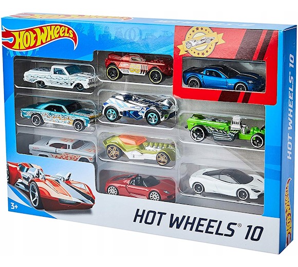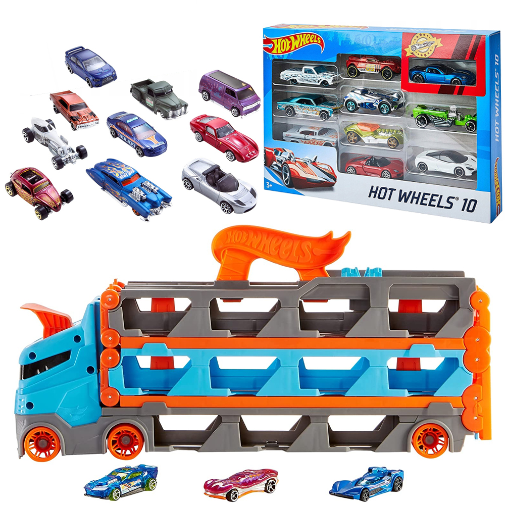 Hot Wheels ciężarówka transporter 2w1 + 3 autka GVG37 + 10-pak autek