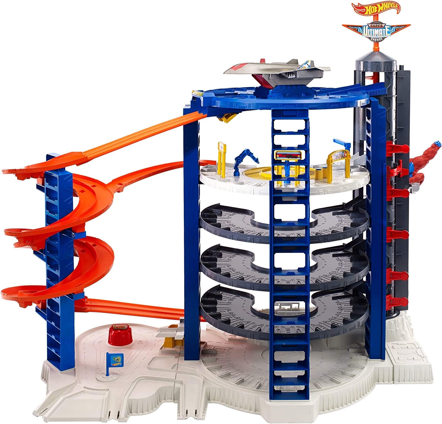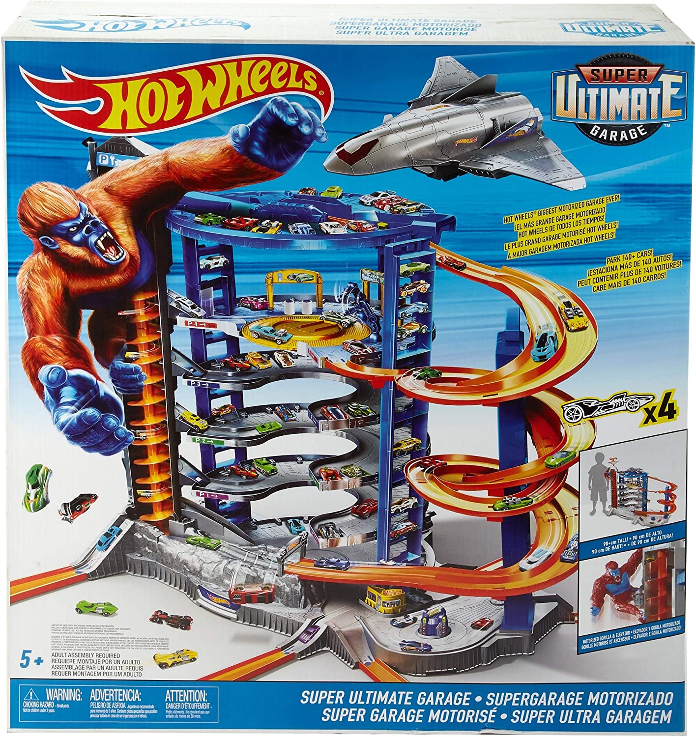Czas na wielką przygodę z wyjątkowym zestawem Hot Wheels Mega garaż Ultimate o wysokości około 90 cm. Zestaw zapewnia niesamowitą zabawę. Posiada on kilka pięter i miejsce na aż 140 samochodzików Hot Wheels! Dodatkowo garaż został wyposażony w windę, która przetransportuje 23 samochody jednocześnie! W opakowaniu są także 4 samochody i 1 samolot odrzutowy. W zestawie znajduje się również restauracja dla samochodów, lądowisko na ostatnim piętrze oraz groźny goryl, który chce strącić wszystkie samochody z windy.