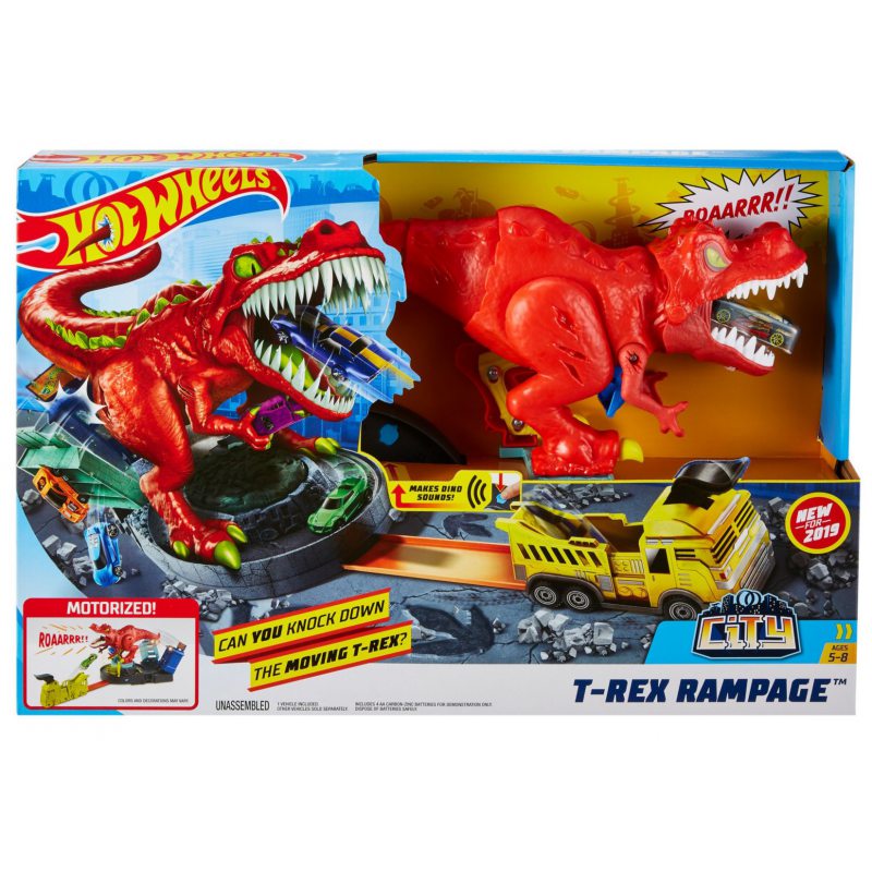 Hot Wheels City zostało zaatakowane przez ogromnego T-Rexa. Potrzebujemy Twojej pomocy! T-Rex jest jak żywy dzięki dźwiękom oraz specjalnym ruchom. Tylko Ty możesz go zwyciężyć, by ocalić miasto! Wystrzel samochód w obracającego się dinozaura, aby go pokonać, zanim zniszczy budynki. Ale bądź ostrożny! Jeśli nie trafisz, możesz skończyć jako obiad głodnego T-Rexa! Zabawę uatrakcyjniają efekty specjalne: T-Rex macha ogonem, ryczy, „gryzie”, a nawet mu się odbija! Atak T-Rexa można łączyć z innymi zestawami Hot Wheels City, aby bawić się na różne sposoby. Buduj i powiększaj świat Hot Wheels, łącząc jeszcze więcej zestawów i torów.