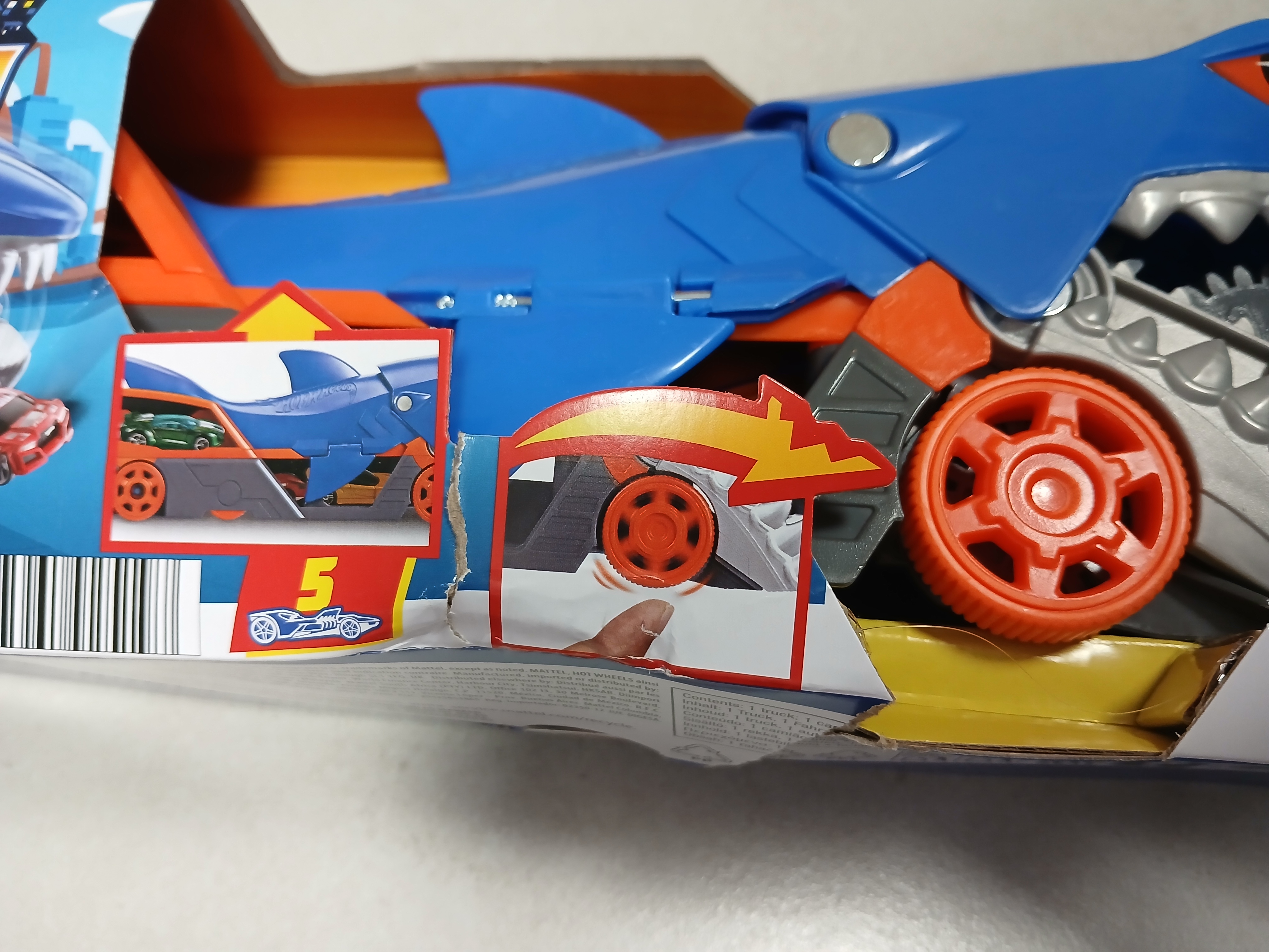 Pora wspiąć się na jeszcze wyższy poziom ekstremalnej zabawy wraz z fenomenalnym transporterem rekinem od Hot Wheels. Transporter został wyposażony w specjalny mechanizm, który uruchamia się w momencie, gdy pchamy pojazd - rekin zaczyna połykać autka, aby móc przechować je w swoim wnętrzu. Ciężarówka może przechować 5 samochodów Hot Wheels w skali 1:64. Z tyłu pojazdu znajduje się rampa, przez którą samochody mogą ruszyć w dalszą podróż. W zestawie znajduje się również jedno autko Hot Wheels.