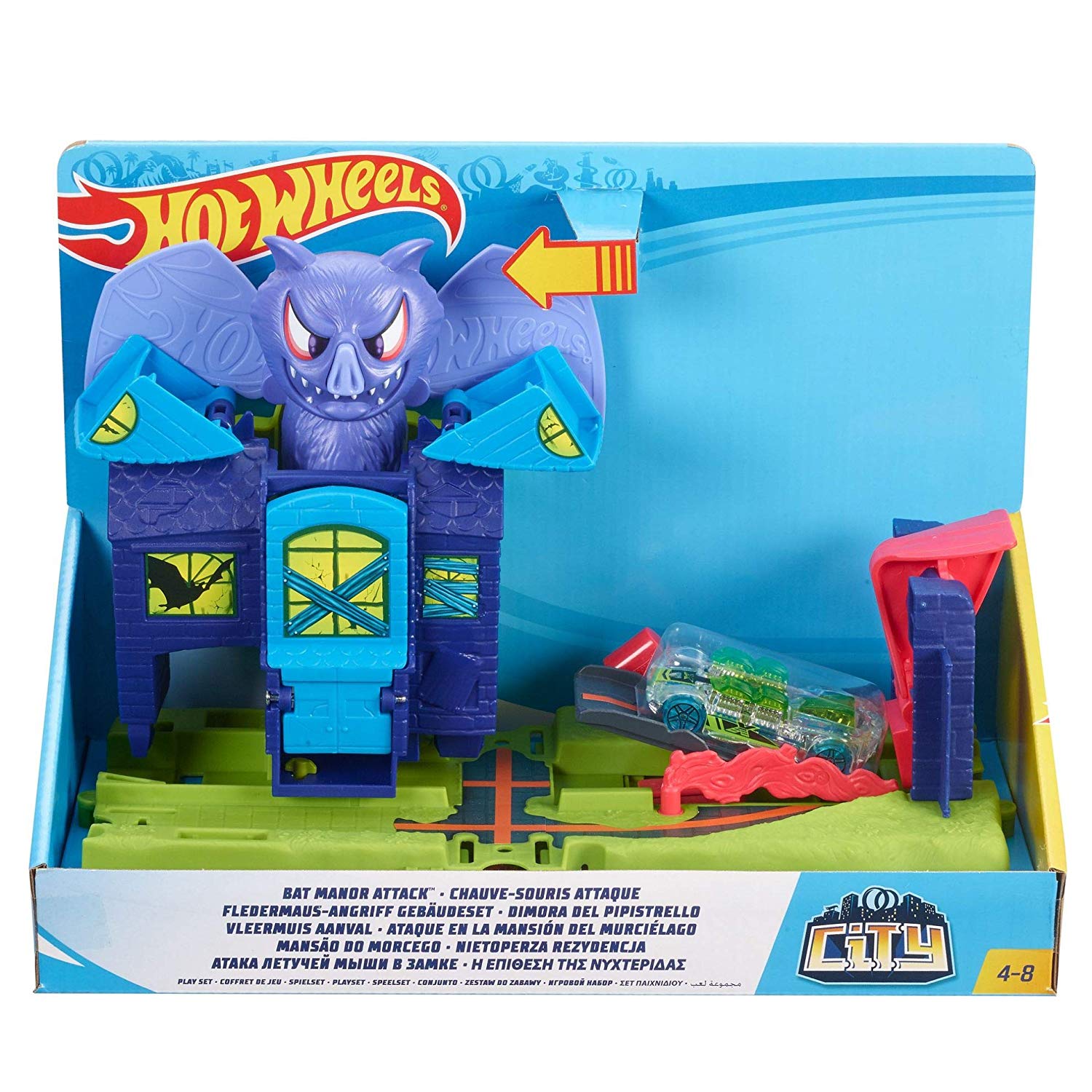 Hot Wheels City Zamek nietoperza FNB05-FNB08 to kolejny fantastyczny zestaw ze świata Hot Wheels City, dzięki któremu stworzysz niesamowity tor, na którym twoje autka będą wykonywały wspaniałe kaskaderskie wyczyny. Zestaw zawiera wiele ciekawych tematycznych elementów, dzięki czemu zbudujesz trasę do uratowania miasta. Pokonaj aligatora, który kryje się w warsztacie, nie daj się wystarczyć nietoperzowi ukrytemu w opuszczonym domu i koniecznie uważaj na pająka w parku!