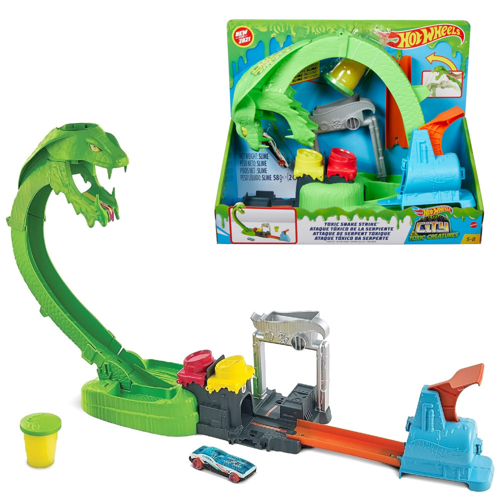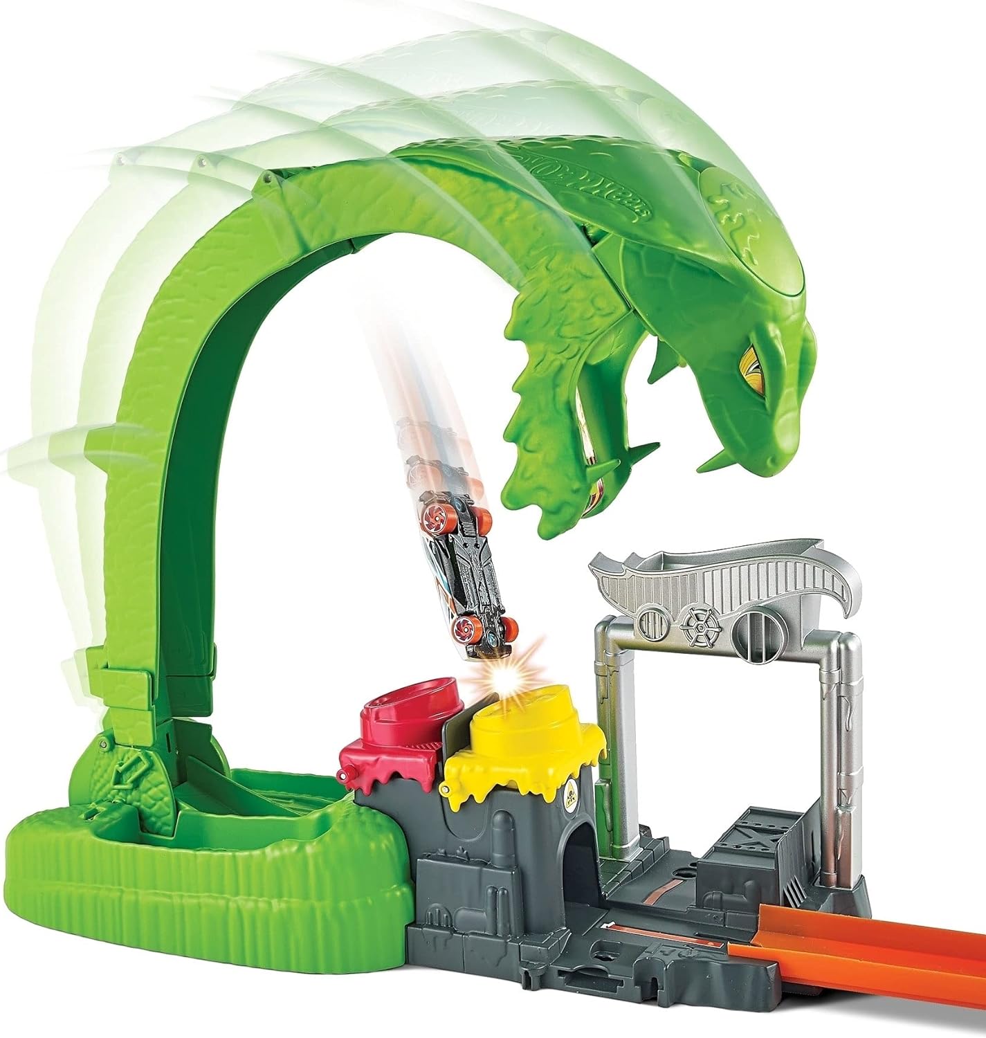 Zestaw do zabawy Hot Wheels Toxic Creatures Jadowita kobra zapewni dzieciom ekscytującą przygodę ze slimem. Poślij swój pojazd w trasę, na której czai się niebezpieczna ogromna kobra z kłami ociekającymi zielonym slimem. Jeśli pojazd nie będzie wystarczająco szybki, może utknąć między jadowitymi kłami.