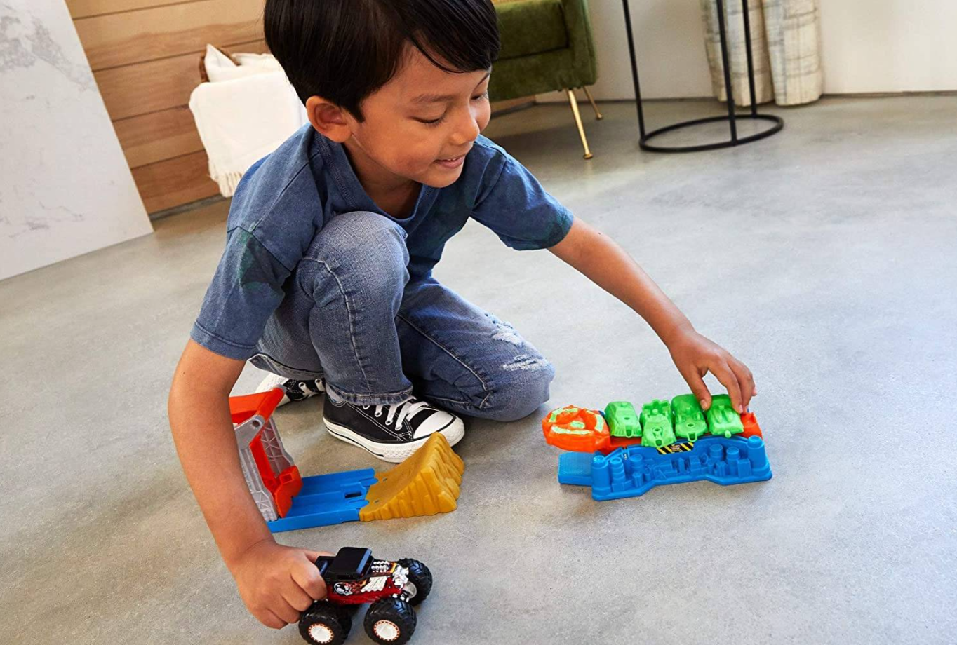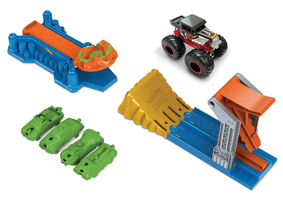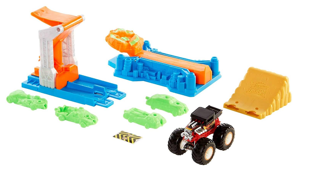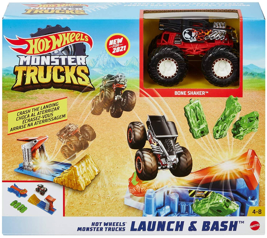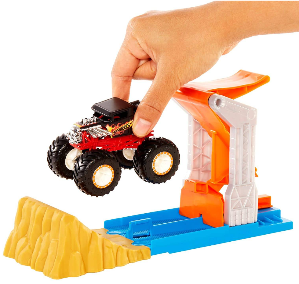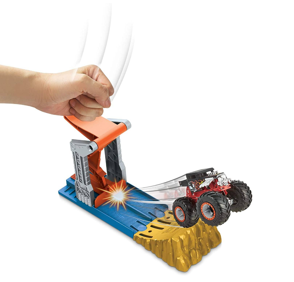 Ten wspaniały zestaw pozwala przeżyć niesamowite emocje! W opakowaniu jest efektowna wyrzutnia dla pojazdów Monster Trucks w skali 1:64. Wyceluj pojazdem w stronę strefy lądowania z ułożonymi na niej wrakami! To zestaw nastawiony na niesamowite popisy kaskaderskie z efektowną finałową kraksą.