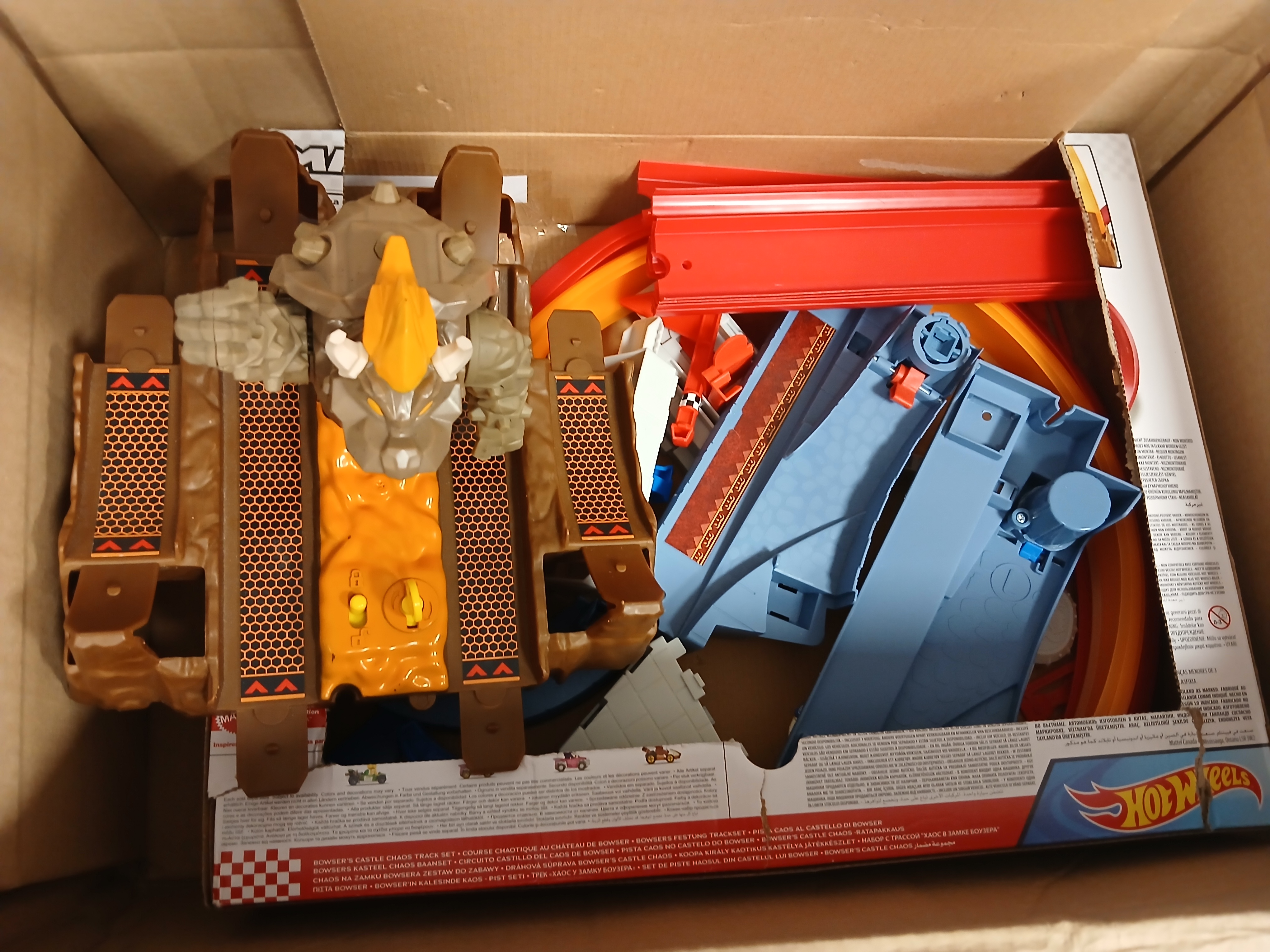 Przeżyj dynamiczne przygody z Mario i jego przyjaciółmi na torze wyścigowym fortecy Mario Kart Bowsera. Aby pokonać przeciwnika, musisz pokonać 5 okrążeń na torze bez wypadnięcia. Unikaj pięści Bowsera i jako pierwszy dotrzyj do celu. Forteca Hot Wheels Mario Kart Bowsera Tor wyścigowy z podwójnymi pętlami, na których możesz ścigać się obok siebie W zestawie jeden pojazd Yoshi.