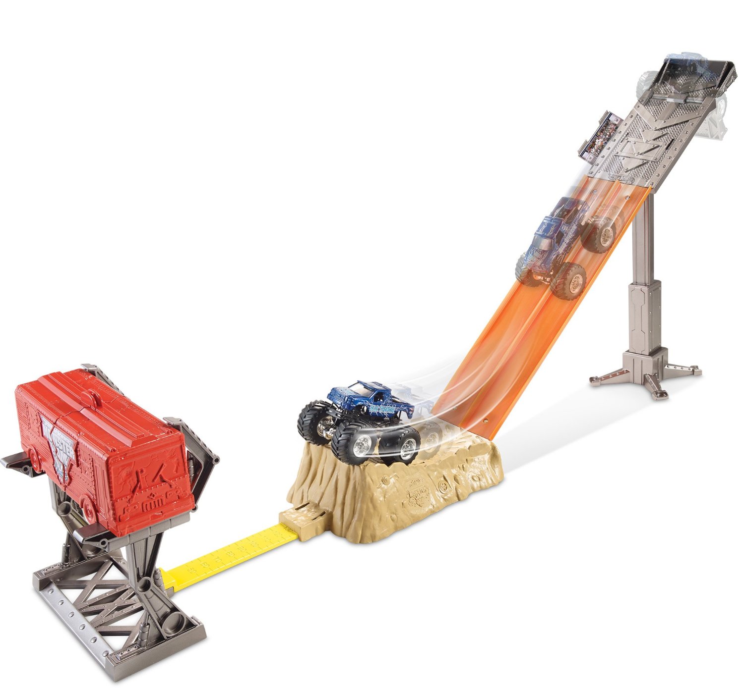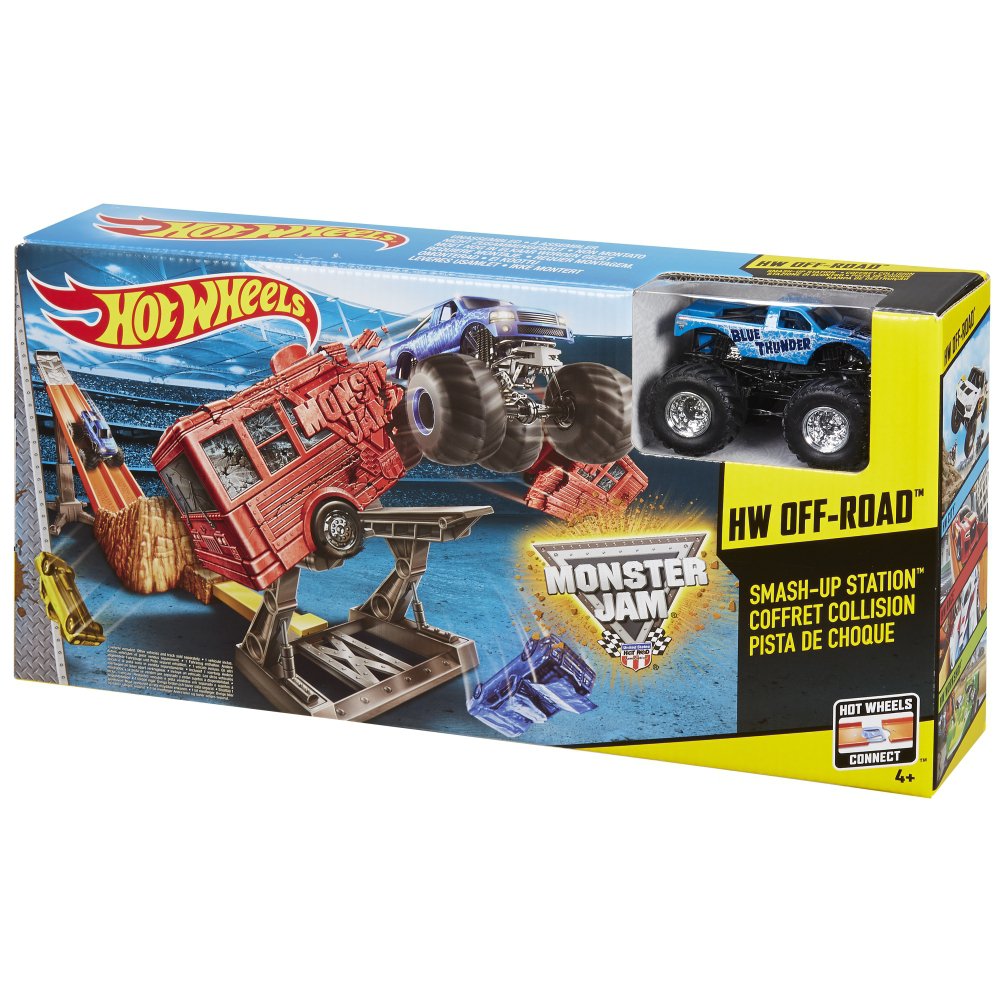 Wypuść swój pojazd Monster Jam na tor i mocno się trzymaj, bo zaraz zacznie się totalna demolka! Podnieś podjazd i wypuść swoją półciężarówkę Monster Jam, aby rozkręcić ekscytującą akcję. Zobacz, jak pędzi w dół, przejeżdża przez błotny podjazd i przebija się przez rozpadający się autobus, powodując, że jego kawałki lecą w obie strony! Dzieci mogą odtwarzać swoje ulubione momenty z pokazów pojazdów Monster Jam® podczas zabawy dwoma zdezelowanymi samochodami.